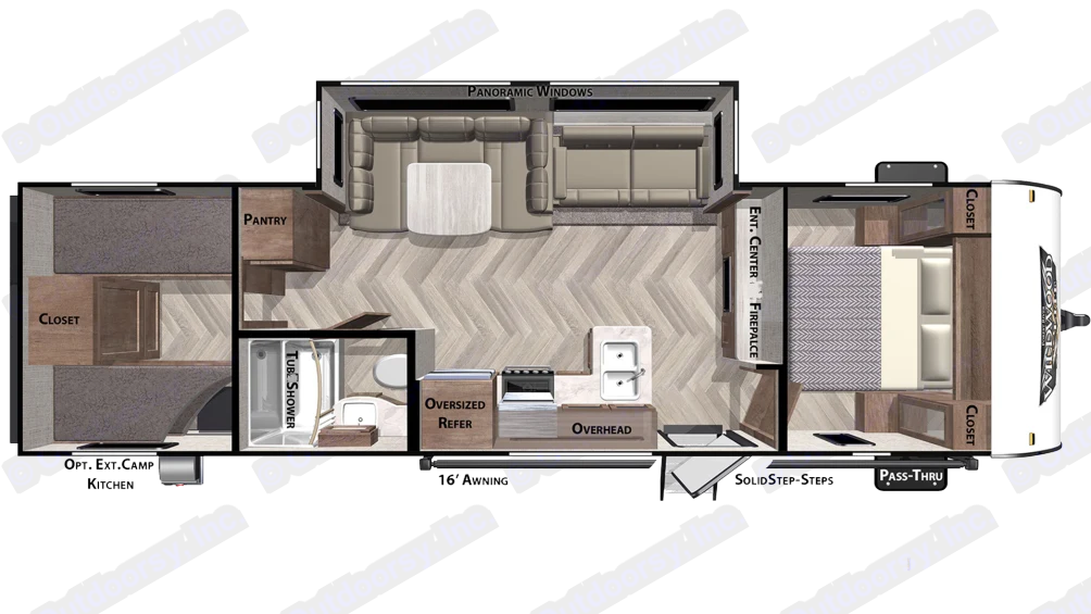 A 16ft retractable awning with outdoor rope lighting, speakers, gas griddle, and electric mini fridge are great for entertaining outdoors. The outdoor water connection/hose provides the ability to wash off after a hike or walk on the beach. A keyless door latch makes for easier access and eliminates to need to carry keys around.