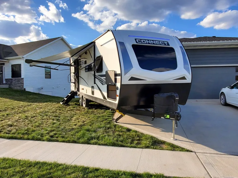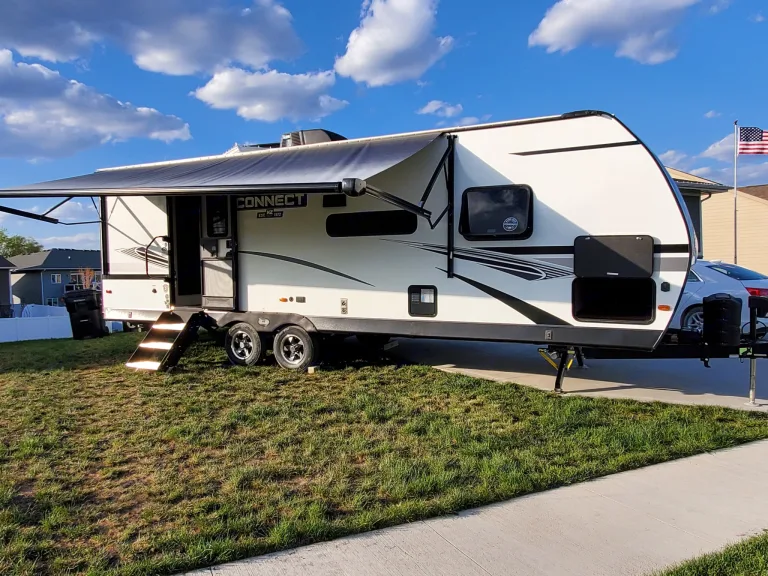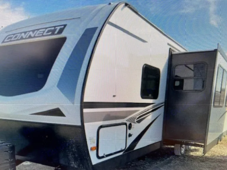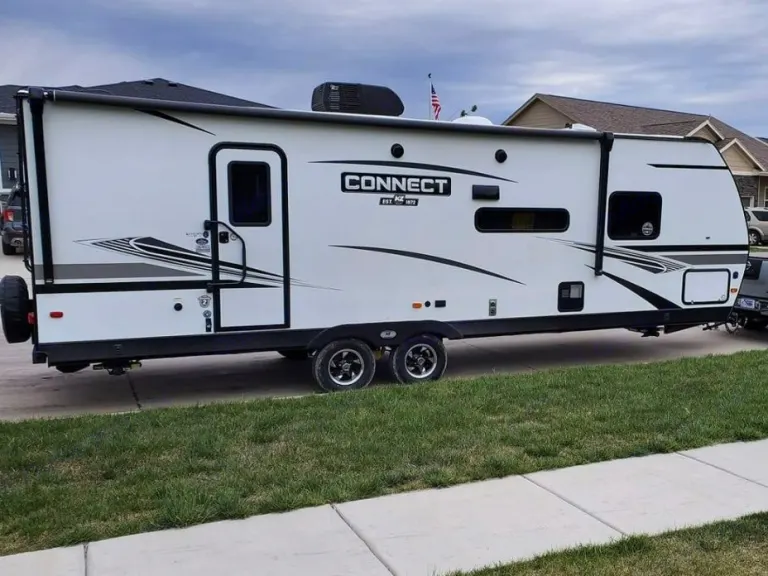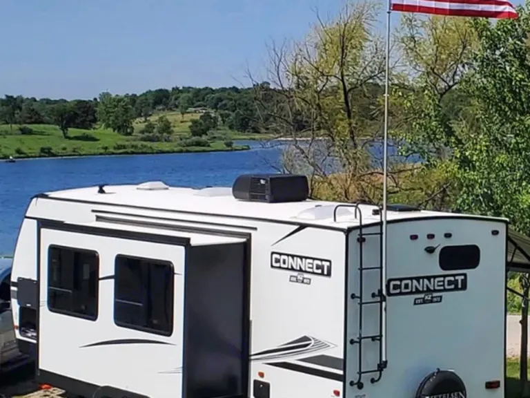 The KZ Connect travel trailer is a trailer with extreme style and creative floorplans! Wrapped up in a lightweight package, the Connect has gorgeous interior décor and a high-end fiberglass exterior. You will find a fiberglass front cap with front windshield, a power front jack, exterior speakers, a spare tire, Equa-Flex suspension, nitrogen-filled tires, a leash latch, and a heated, insulated, and enclosed underbelly, and that's just the beginning. There is still plenty more to check out, like the well-appointed interior that has a kitchen skylight, an Hdmi/USB charging port, LED motion-sensor lights, an electric fireplace, and upgraded linoleum flooring.What's includedIt will have a 22ft flag pole if you would like to use it. It will show you how to put it up if needed. It will come with a flag.