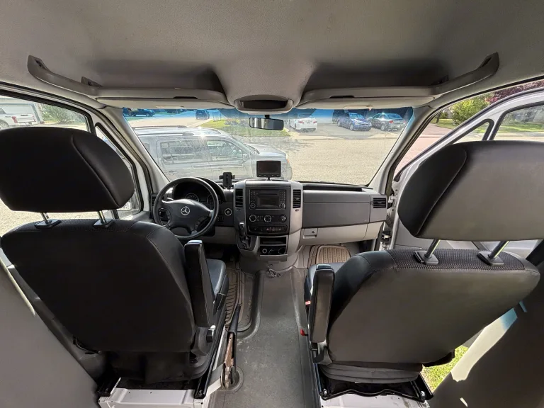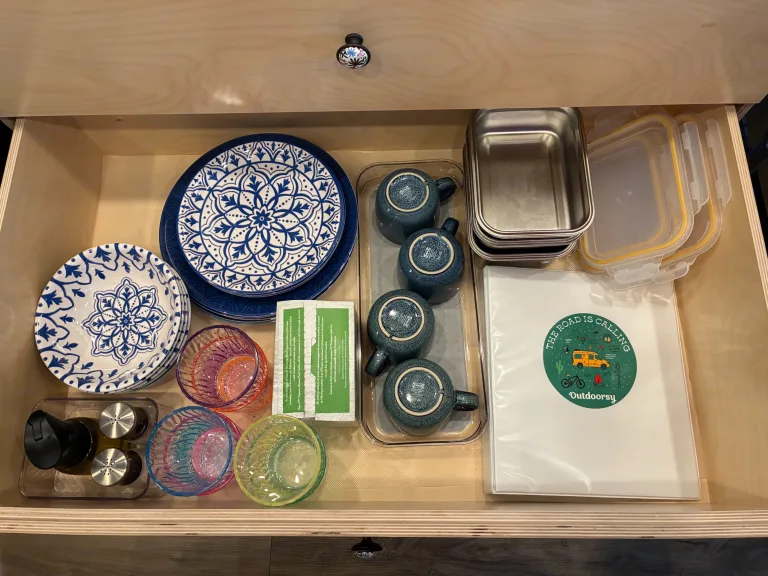 High quality birch cabinetry provides ample storage for food, clothes, and whatever else you need to keep in them.  Underneath the passenger seat bench are baskets that can be used for shoes, toys, laundry etc.  Above the front cab there is a mesh strap storage compartment.