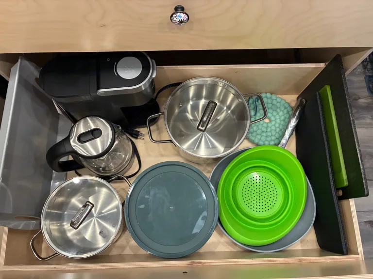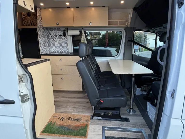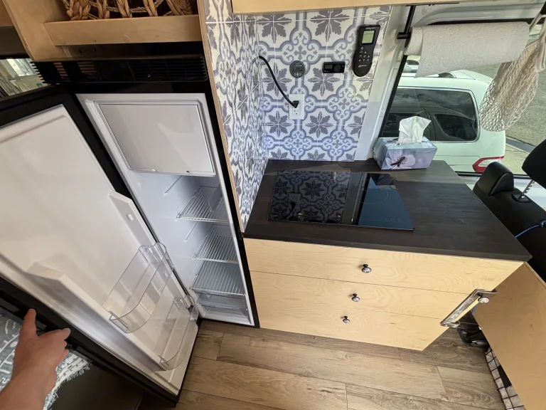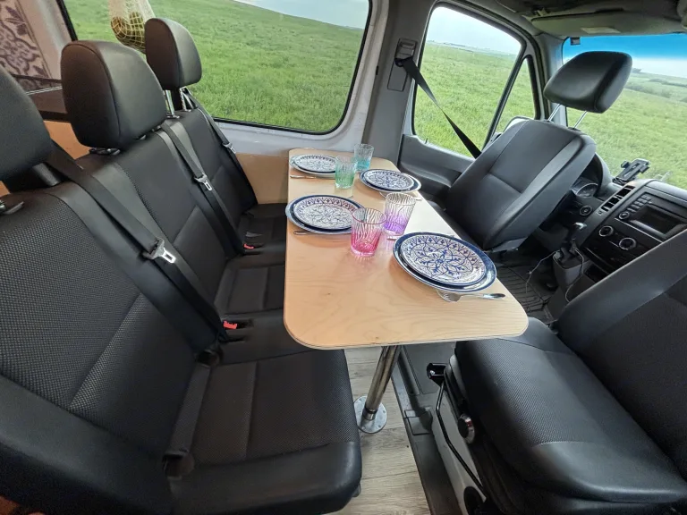 The fridge is large for a campervan with a nice freezer to top it off, because we wanted to allow for longer trips while cooking fresh meals (and ice cream!).  For meal cooking we have a double burner induction cooktop.  We also provide you with an outdoor camp-stove and table with a small bottle of propane, if you'd like to grill outdoors. The kitchen is fully stocked with all the tools and utensils for making and serving meals.  We also include a small Keurig coffee maker with pods and an electric tea kettle with assorted tea bags.  Inside the cupboard you will find a complementary hot chocolate and iced tea powders.  The deep sink with a pull out faucet makes it easy to wash dishes or spray down muddy gear outside. You will notice many creative touches throughout the van to make the most of the space.  The dining table easily sets up on legs in the front cab area so everyone can sit down together for food or game playing.  Note that the under-sink gray water tank needs to be emptied daily so it doesn't overflow (it's a simple task).