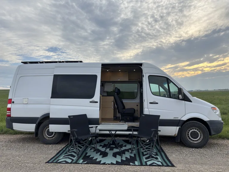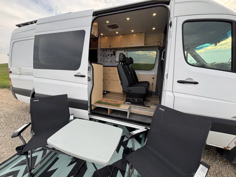 We include a large outdoor RV mat to extend the living space outdoors and 2 comfortable camping chairs.  The included folding table can be used along with the provided cards or games to bring game playing outdoors.  If you're interested we have the fun outdoor game of Mollky and a frisbee in the van to play at the campsite.  If someone gets injured on the adventure the first aid kit is right above the sink for quick access (also where you'll find bug spray!). For exploring the mountain parks we include a Kananaskis area pass and a can of bear spray. You will need to purchase a National Park pass for the duration you will be in areas like Banff, Lake Louise, Jasper etc (the pass is specific to the driver who purchases it, that is why we can’t provide one for our guests or else a fine could be incurred). A Bluetooth speaker is provided for listening to your music or audiobooks while driving or hanging out. To keep bugs out we have a great screen that covers the whole sliding door space to allow a fresh breeze to come in.