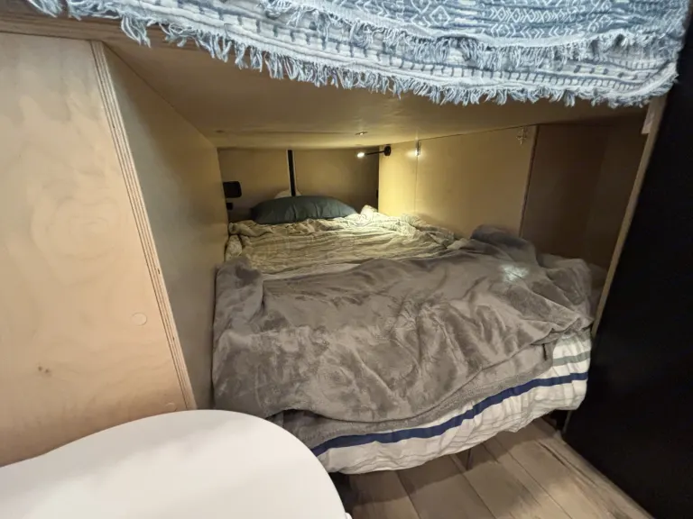 The main bed in back is an RV queen mattress with memory foam topper for a total of 12 inches of sleeping comfort.  Underneath is a twin sized mattress for a second sleeping space.  Both areas have flexible reading lights installed.  For those who need more than 3 sleeping spaces, we have a Cabbunk bed system that sets up in the front driver/passenger space at night.  It provides 2 extra cot style bunks for those under 150 pounds each.  Don't worry about light at night because each window has a custom magnetic insulated cover sewn in Quebec to keep things dark.  We have 3 fans for ventilation (or white noise!)  and to help keep things cool; one in the roof, one by the bed, and one on the floor as part of the heater. Speaking of the heater, if the night or day is chilly, simply adjust the thermostat to turn on the installed Espar heater.