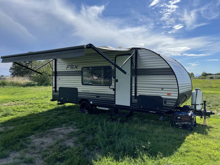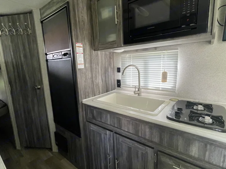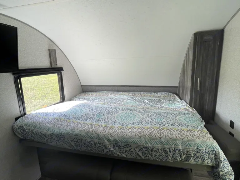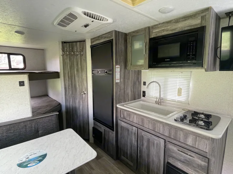 The camper is packed with features and weighs in at less than 4,000 lb. The unique front queen bed flips up to create additional seating space during the day. The kitchen provides a booth dinette, panoramic window, and modern appliances, while the rear bunkhouse gives you double over double bunks for additional flexibility and comfort.What's includedTravel trailer includes fresh linens, camping chairs, towing hitch, kitchen amenities, including pots/pans, plates, cups, utensils, grilling utensils, and outdoor carpet.
