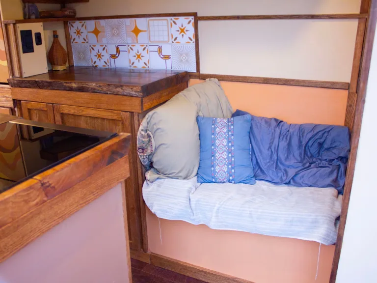 Spacious and plenty of seating; space is optimized by the folding down Murphy bed. Slider drawers slide out below to create a bench seat. Turning the counter into your work station, morning coffee or meal time table. Or kick back on the love seat.