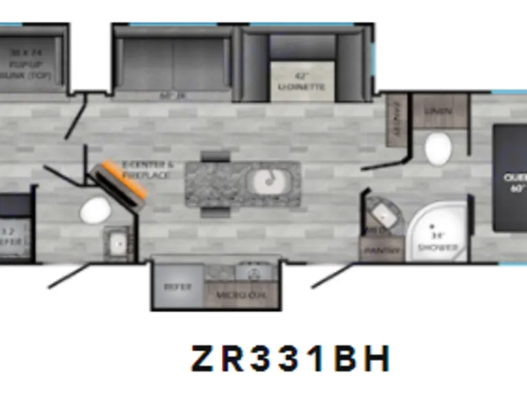 The "Rollin' Inn" is a brand new 2020 Crossroads Zinger model ZR331BH. It is a two bedroom bunkhouse that features three large slide outs, an 18' awning, the convenience of all electric jacks and stabilizers, microwave, stove, range top (inside and out), outside kitchen with sink and range top, a large refrigerator/freezer inside and 2 cf fridge/freezer in outside kitchen, tented windows, and more. All the accessories you will need are loaded up and ready for adventure.The inside of Rollin' Inn is packed with high-end components including a fireplace, two air conditioners (the bunk house has one and the rest of the camper has one that is a ducted unit), full functioning furnace, both electric and Propane water heaters, blue LED mood lighting. The bunk house has its own half bath with both inside and outside doors and the master bath has a custom built vanity and a stand up shower, and both bathrooms have ceiling vents. The living area has a fold down couch that converts to a twin size bed and a dinette that converts into a full size bed.