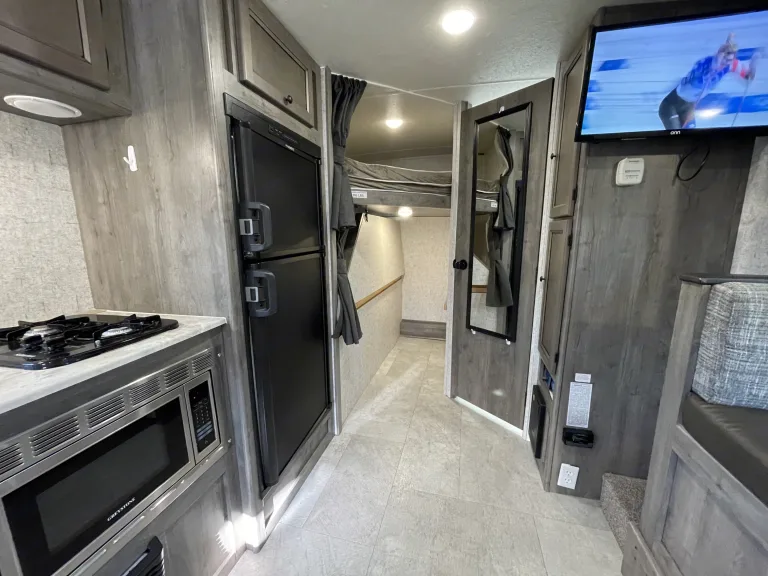 Embark on an out-of-this-world journey with our lightweight travel trailer, "Astro." Measuring 24' long and 7.5' wide, this modern travel trailer will transport you to new dimensions of comfort and convenience. Despite its compact size, "Astro" maintains an incredibly light dry weight of 3900lbs, thanks to its innovative aluminum and composite construction.Prepare for a celestial slumber with doublewide bunks, providing ample sleeping space for two small humans or one adult each. The rare optional queen murphy bed adds versatility, transforming into a cozy sofa during the day. Experience the stars from the full front window.Delight in cosmic cuisine with two kitchens at your command. The indoor kitchen boasts a double kitchen sink, microwave, and a two-burner gas stove, simplifying meal preparation. An extra-large fridge with a separate freezer keeps your food chilled, powered by propane on the go or electric when camping. And don't forget the outdoor kitchen, complete with a mini fridge, small counter with an outlet, and a slide-out Coleman Camp Grill or optional Blackstone griddle.Tune in to your favorite channels, even in the remotest corners of the galaxy, using the TV with a powered HD antenna. The Bluetooth indoor/outdoor speakers offer versatility, doubling as a radio for your adventures."Astro" comfortably accommodates up to 7 travelers. Experience the powerful cooling of the AC, enhanced by two Maxxair roof fans that circulate refreshing air throughout the camper, ensuring a comfortable slumber. The double-wide bunks provide cozy havens for intergalactic dreamers, while the front murphy bed transforms into a memory foam mattress with a plush pillow topper. Fitted bottom sheets are included for your comfort.Embark on an otherworldly adventure with "Astro." Let its stellar features and design transport you to new frontiers of RV exploration. Unleash your wanderlust, embrace the cosmic possibilities, and create unforgettable memories among the stars.What's includedPrepare for an out-of-this-world camping experience with "Astro"! We've got you covered with a stellar lineup of included amenities and essentials to make your journey smooth and comfortable:Towing & Safety Equipment: