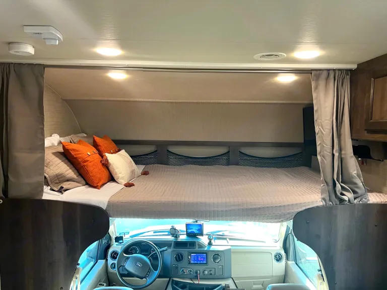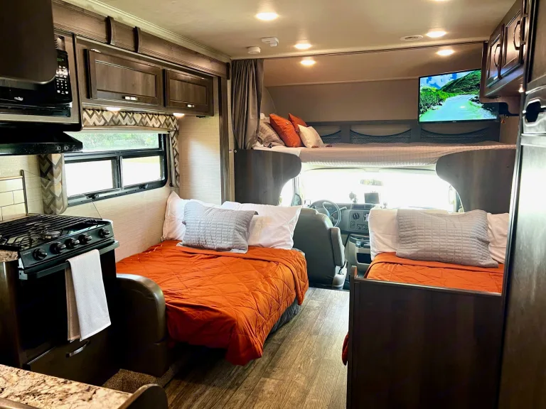 Our Motorhome is versatile to fit any need. If you have driven a U-Haul, box truck or similar, then this will be a breeze to drive around. From taking a long cross-country excursion, peaceful camping trip by the lake, traveling for hunting season, or taking your friends and family on a wonderful getaway, our motorhome is the one you are looking for. Traveling with many luxuries, what our motorhome has to offer is the best relaxing way to have the rest and recovery you are looking for. Plus, our ”Welcome Book” we provide, and our availability will simplify the ease of use, giving you the best adventure you can have.This motorhome seats 8 people and sleeps 8-10 people depending on size. With a spacious queen master bedroom with a ward and dresser, 2 twin bunkbeds, a sofa that converts into a 1-person bed, a 4-person seating dinette, which converts to sleep 1-2 people and a bunk over the cab with a swing mounted TV that sleeps 2 people making it versatile and suitable for families of any size to take this coach on the road. The kitchen has all the appliances you need to keep meal cost conveniently low while you travel. These includes a gas range, gas oven, microwave, refrigerator/freezer. Kitchen includes coffee maker, basic kitchen utensils, pots, and pans for use and plastic dinnerware set for 8 people. Taking you outside, relax under the shade of an 11ft electric awning. Stowaway all your gear in the many compartments inside and out.Our motorhome has a few performance and driver upgrades too! The engine has been tuned to give you more MPG’s than your standard Ford E450. The driver console has a tire pressure monitor for all 6 tires, Phone/GPS holder, an always on (when plugged in rearview camera) so you can see what’s behind you, a gravity/analog tilt/roll gauge so you know how you sit when driving or camping.