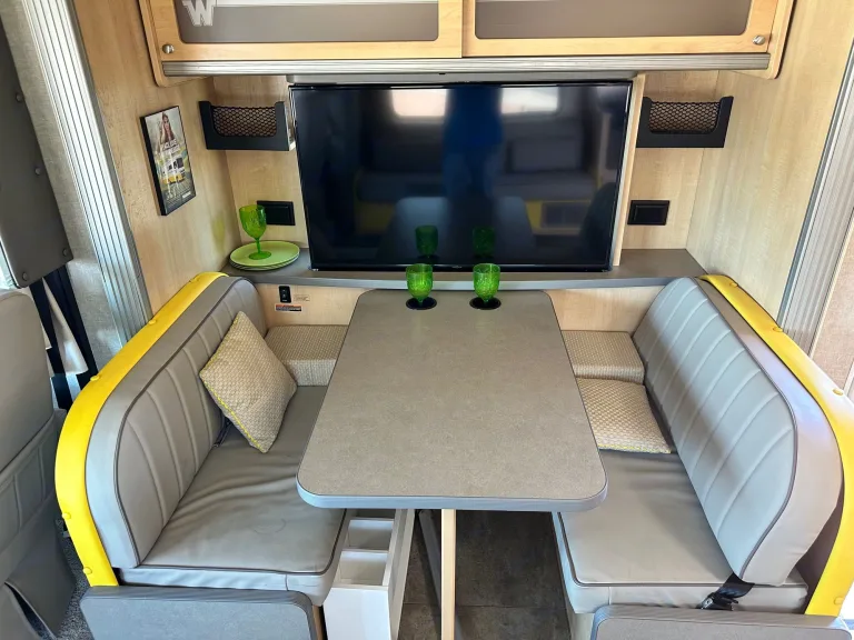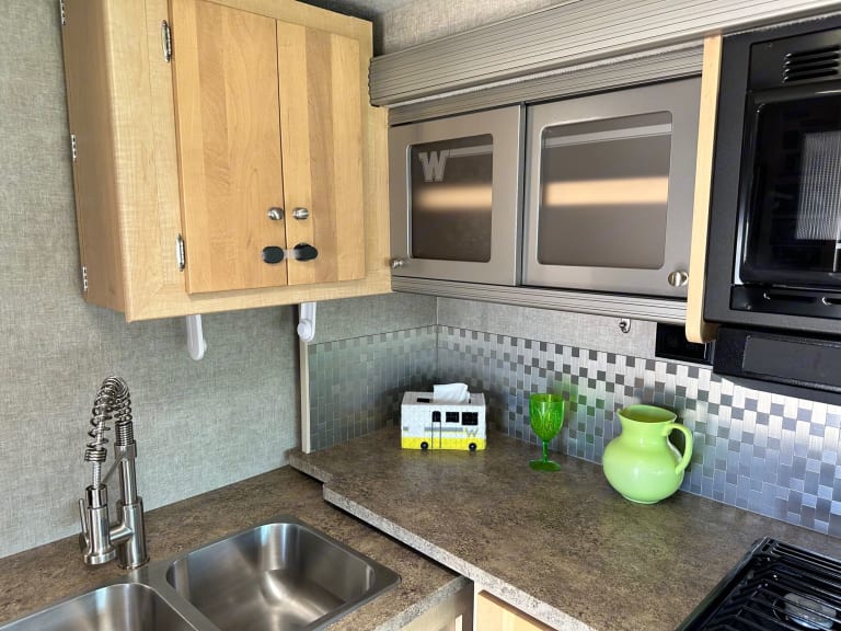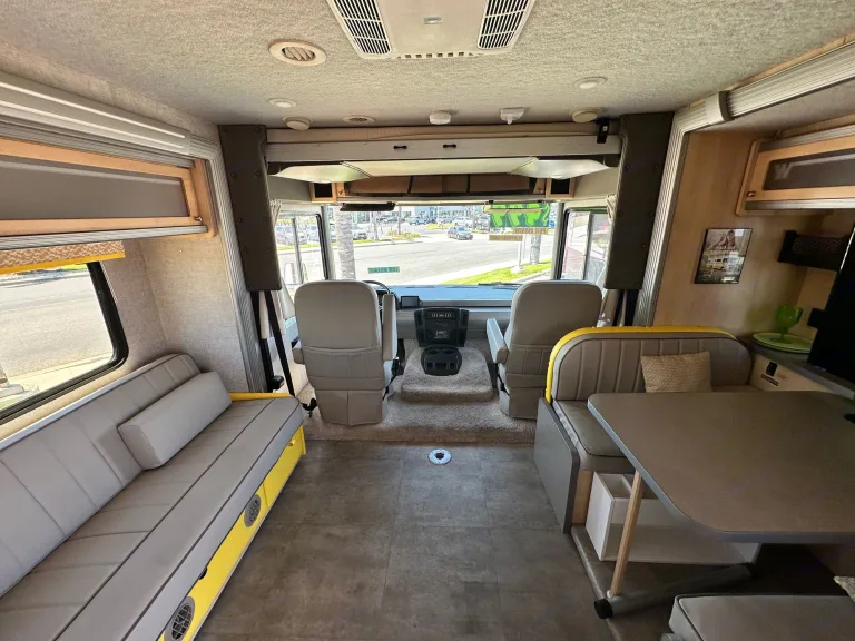 Barbara.What's includedWe provide everything you need to have a great experience. Kitchen comes fully set with dishes, glassware, utensils, silverware, pots and pans, bakeware and serving items. There is a keurig style coffee brewer and some pods to get you started.There are fresh linens for all of the beds and towels, and toilet paper for the bathrooms with prefilled soap dispensers.There is a pop up tv in the living room and one in the private master bedroom. The sofa and dinette breakdown into two single beds and there is a drop down raised bed above the driving area with ladder accessibility.There is a generator on board with an inverter as well for all of your power needs.We include a beach package with your daily rate that includes 4 beach chairs, 4 beach towels, and a day cooler for you to enjoy your favorite snacks or beverages, as well as two boogie boards.We've also included games and puzzles inside for cozy downtime.We have an electric bike option that you can add on for only $15 per day. This includes a heavyweight bike rack, two easy to manage electric bikes and two bicycle helmets to keep you safe.We love dogs and they are welcome aboard as long as they are potty trained. There is an additional pet deposit required.Other things to noteSorry, no festivals, tailgates, or off roading.