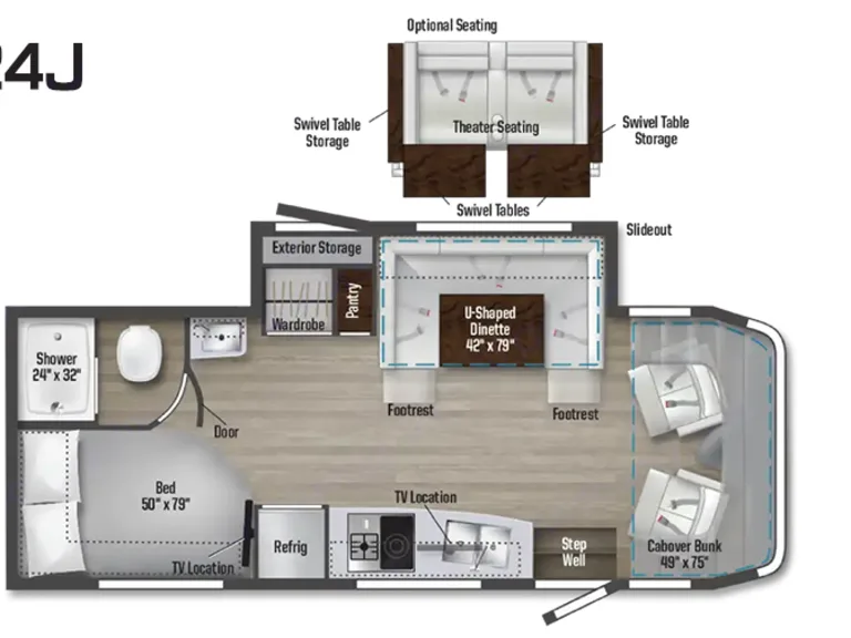 Aluminum cab steps w/logoed tread and loop attachment Powered patio awning w/LED lights and Bluetooth control Large pass-through storage compartment (24D, 24J) LadderHeating & Cooling