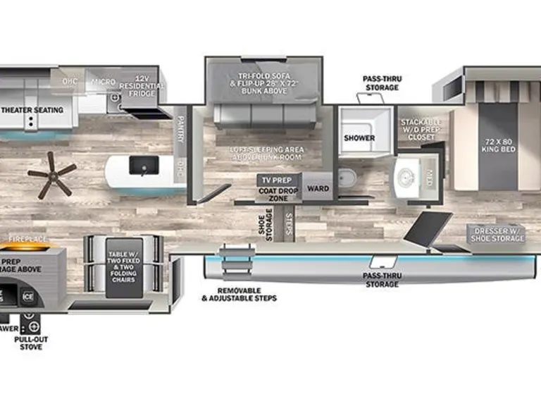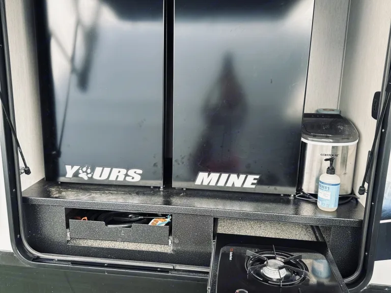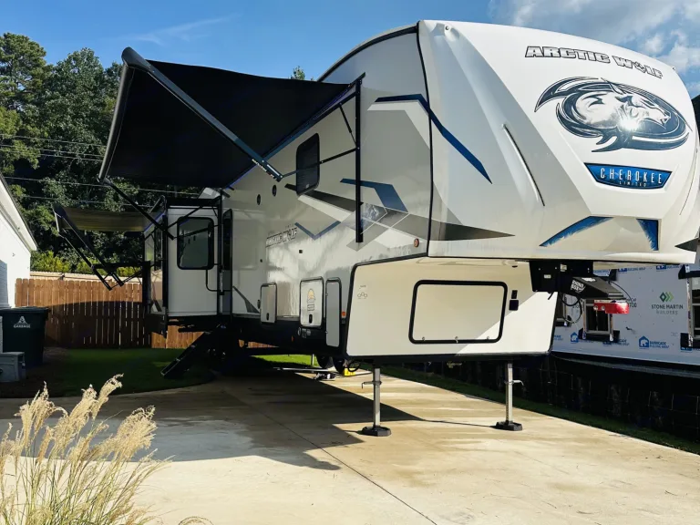 From the hosting the ultimate tailgate to a relaxing family getaway, this camper has everything you need to make your weekend getaway dreams come true! You pick the spot, we bring it to you! This spacious fifth wheel camper is the perfect mix of luxury and the great outdoors and has room to bring the whole family along. It is fully stocked and ready to go, just pack your bags, adventure awaits!Indoor Features:- 2 A/C units- 2 Private Bedrooms: Master suite with king size bed and spacious double closets and tv and bunk room with full size pullout couch and twin bunk with small wardrobe and tv- Queen sized loft- Full size pullout couch in living room- 3 TVs (master, bunk room, and living room)- Soundbar- Electric Fireplace- Two Heated/ Massaging Recliners- Fully Equipped Kitchen: includes refrigerator, microwave, stove, oven, air fryer, coffee maker, pots, pans, kitchen utensils, plates, bowls, cups, and moreOutdoor Features:- Two large awnings with LED light strips- Outdoor kitchen: including two outdoor refrigerators, outdoor cooktop, icemaker- Blue LED under glow lightingWhat's included• 3 TVs