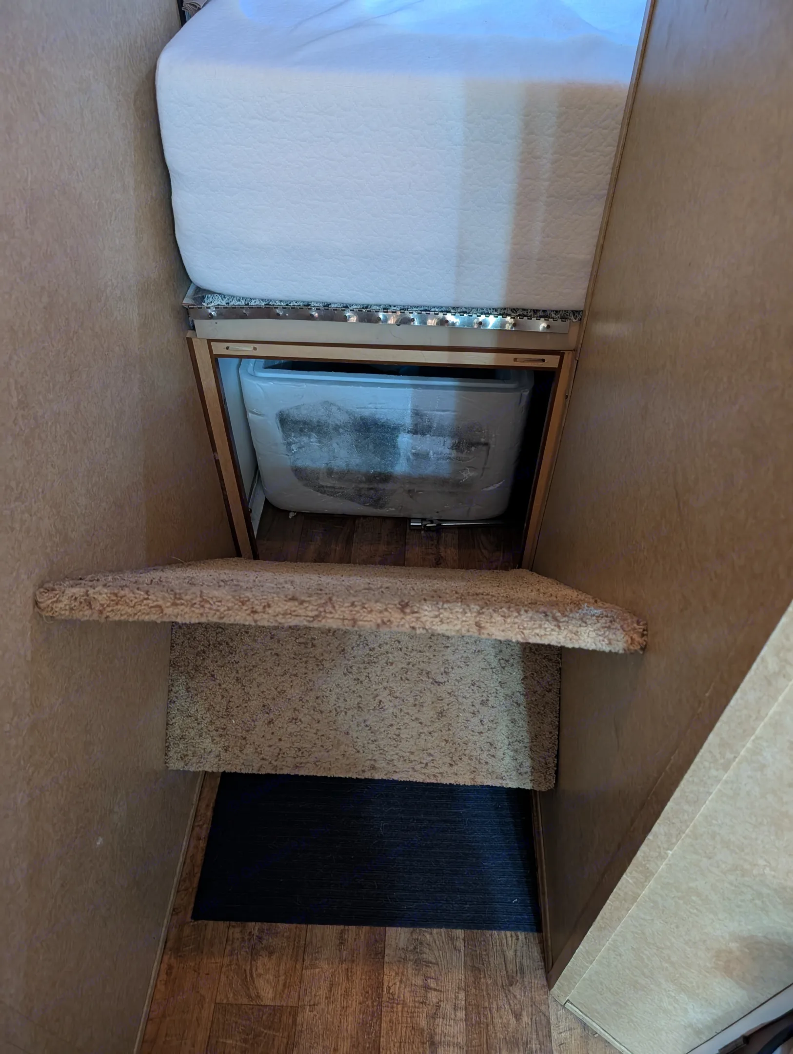 • also, the pass-through storage under the bedroom can be accessed by flipping forward the stairs leading to the bed (we usually put the cooler here & put the 5 gallon water jug & our clothes bags or larger pantry items in the shower, then shower at camp sites tbh)
