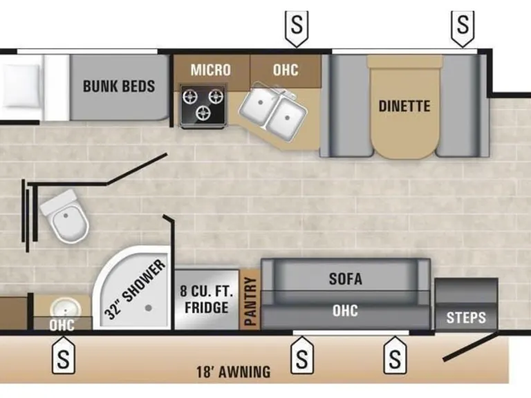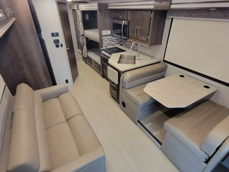 Sleeps Up to 8 – Features a queen bed, over-cab bunk, sleeper sofa, and convertible dinette.