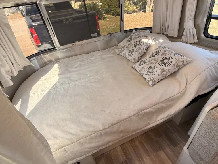 Cozy RV rental bedroom with a comfortable bed, patterned pillows, windows displaying outdoor scenery, and light wood floors.. Airstream Bambi 2024