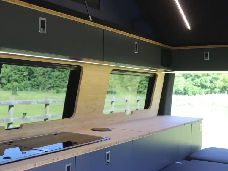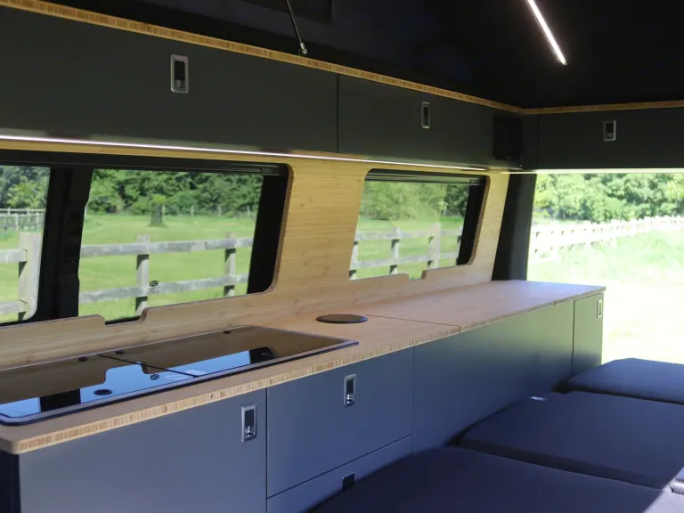 - Fully equipped Incline kitchen with bamboo worktop, 2-burner Dometic hob, sink, and a 12v fridge