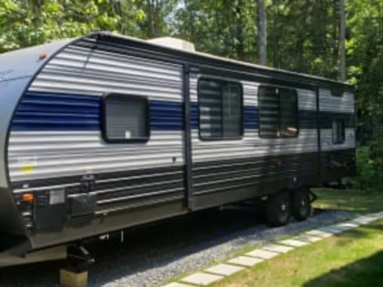 Hi! Welcome to our Travel Trailer. Our trailer comfortably sleeps 7. There is a seperate bedroom with a queen bed and lots of storage. There is also a full bed, foldout dinette, and pullout sofa for sleeping. The trailer has 2 doors, one to main area, one from the bathroom for quick access. We supply all bedding, towels, cooking supplies, etc. We provide all full hookup materials or a generator if you want to go to a state park!