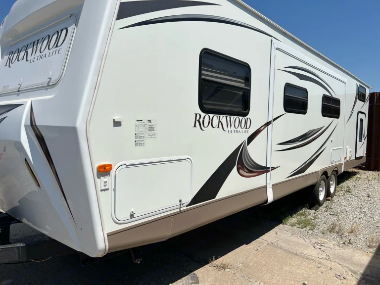 Spacious travel trailer with outdoor kitchen. Sleeps plenty with a queen bed, three bunks, and a kitchen table that folds down.