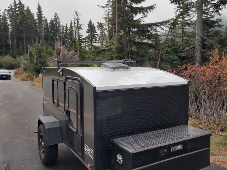 The 'venture rig is ready to go where you need it to go. With some suspension and beefy tires, this little camper is ready for the backcountry as much as most SUVs that can pull it. It has what you need to stay safe and dry with nothing that will tempt you to stay inside on those beautiful days out. After all, the point of camping is getting outside, right!At 2200 pounds, most mid to full sized SUVs should pull it where you need it to go. capable of dirt roads with some bushwacking, potholes shouldn't be an issue. If campgrounds are more your speed, you will make plenty of friends when they come by to see the one camper that stands out and is built for Adventure.What's includedFull (double) mattress and sheets, flashlights, fridge, cook stove, pots and a pan will get you cooking, plates, bowls, cutlery. Roof racks hold 200 pounds per bar and a bike rack that holds one bike on it. There is a 2-inch hitch receiver on the back rated for 250 pounds.Recommendations• It climbed baker for some glamour shots recently, but the parks were closed so we couldn't camp :(.