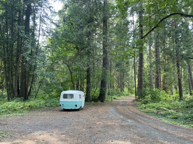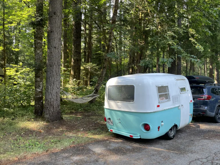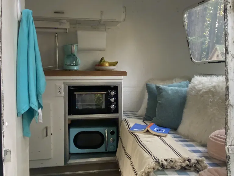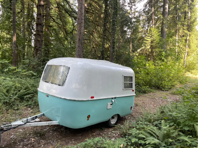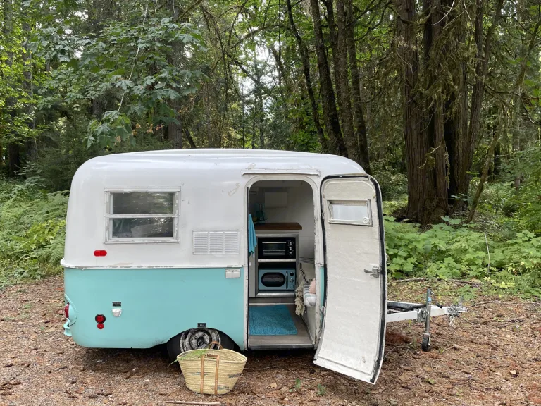 Cute-as-can-be vintage lightweight camper. Amenities and space may be limited, but good times abound.For the full experience, you'll want to head somewhere with electric and water hookups. There is no battery, water tank or toilet so you'll be dry camping without tapping into camping utilities. A 30amp connection will give you access to lights, microwave, toaster oven, mini space heater, AC unit, and whatever else you'd like to plug in. Plug directly into a pressurized water supply in order to utilize the sink. Otherwise you can pre-fill a provided water jug for drinking, cooking and dishes.The camper has a 1 7/8" receiver and weighs just 850 lbs. What's includedBed and couch prepped with clean linens, basic kitchen items and propane camp stove provided, camp chairs includedRecommendationsNo generator provided so we recommend you either camp with hookups or else dry camp without power (heater, AC, microwave & toaster oven and most lights). There are battery-powered LEDs and a propane stove with french press coffee setup as well as a fillable soft-sided water container for dry camping fun.