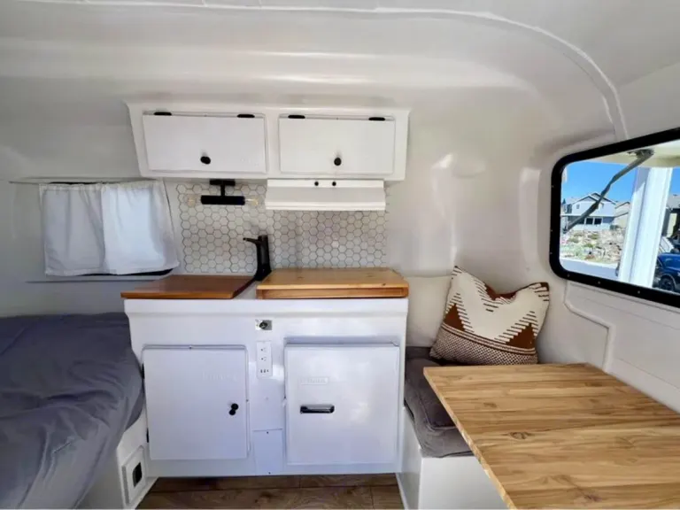 Towed with a Camry before, this adorable “Marshmallow” of a camper is all you need for a few days off the grid!Tall ceilings for anyone under ~6’3, running water without hookups, solar panel for lights and mobile charging, a fridge, stove, small closet, dining area, and enough space to fit 3, Marshmallow is your perfect and simple solution for a mountain getaway! What's included• bedding for 3