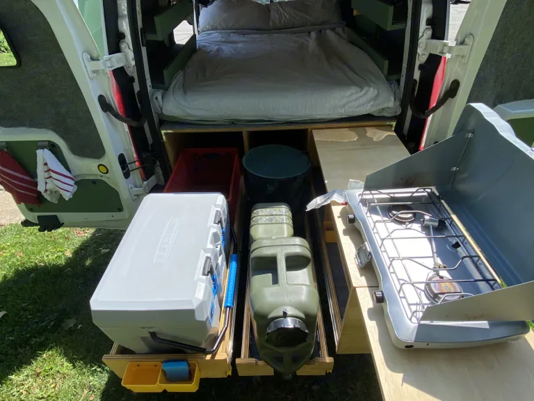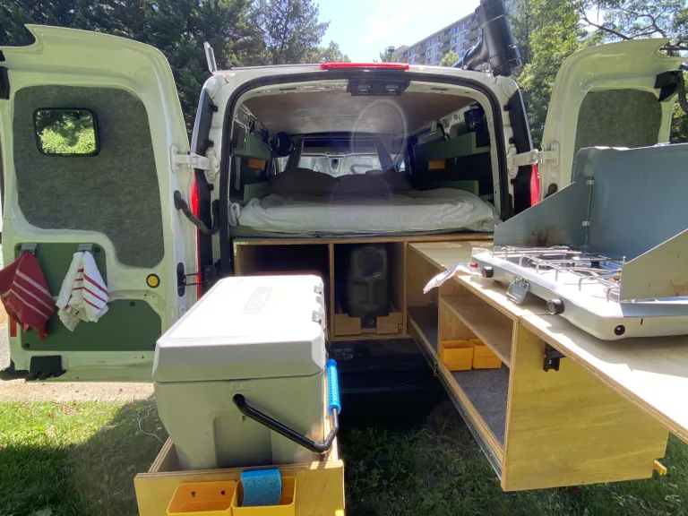 We slept like babies every night thanks to the comfy memory foam mattress. It’s a small but ultra-functional camper, easy to park anywhere, and a real joy to drive. Manual mode makes mountain driving smoother and more fun.We traveled through all kinds of weather—from 30°C (90°F) in Zion to -2°C (28°F) in Yellowstone—and always slept comfortably. On warm nights, we cracked open the back door slightly or used the included fans. On cold nights, the memory foam and blankets kept us cozy. We also used magnetic mesh window screens for airflow and to prevent condensation, which worked perfectly.You’ll find everything you need to live on the road:Comfortable bed for 2