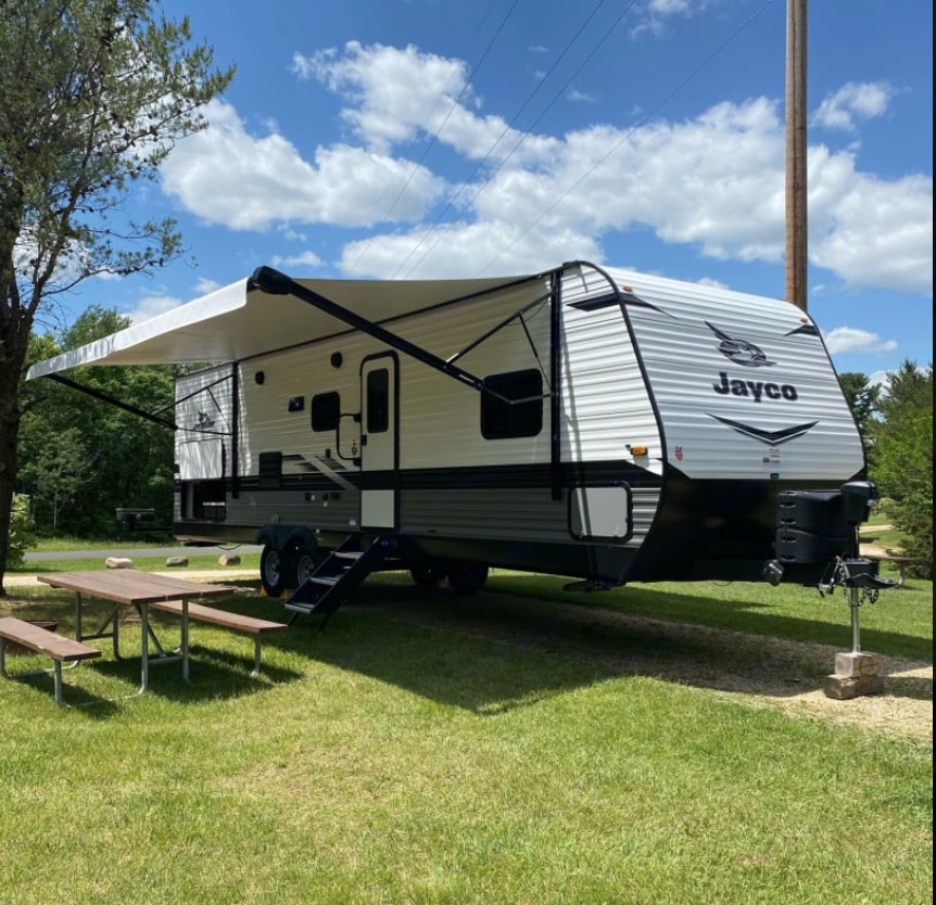 Our Jayco trailer is ready for all your family trips! The interior of the 28 foot trailer includes: a kitchen, a master bedroom with queen bed, bench + dining table that converts to a bed, futon couch, full bathroom, entertainment area and much more. The exterior of the trailer is covered with high quality aluminum and contains several storage compartments and a complete outdoor kitchen containing: a mini-fridge, a 2 burner propane grill connected to the trailer, sink and storage. An outdoor shower is also available as well as electrical outlets for all your needs. So, what are you waiting for? Reserve now!Departures are after 2pm.