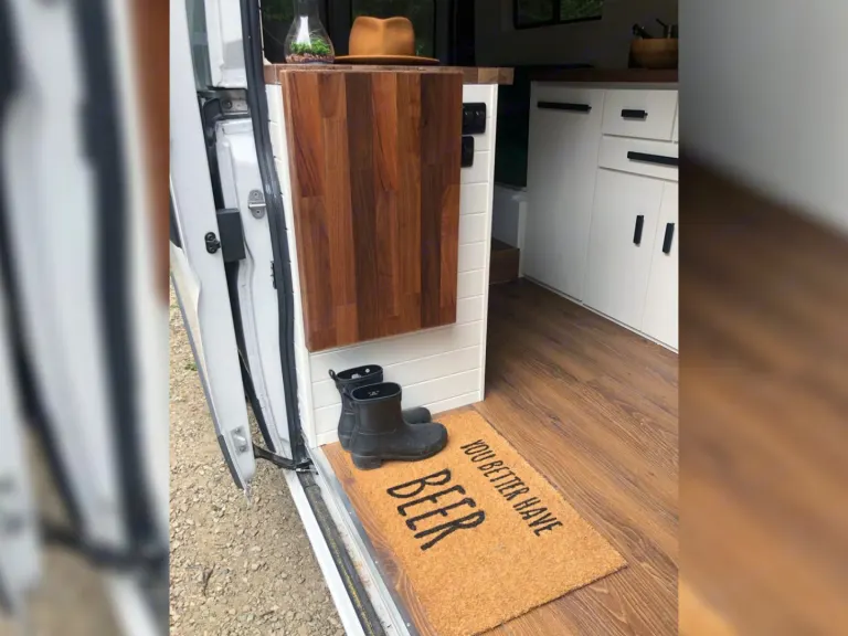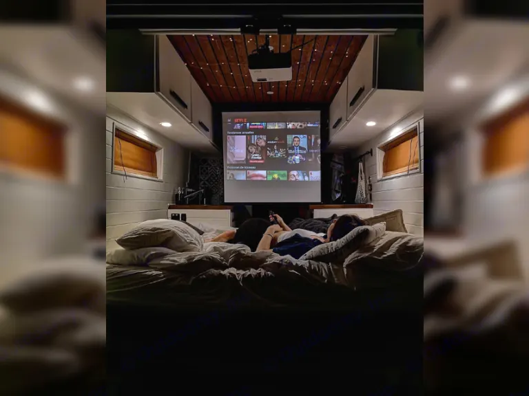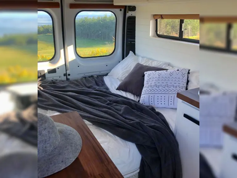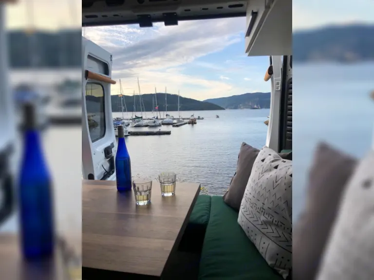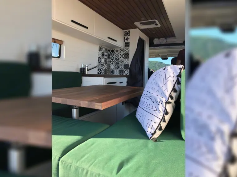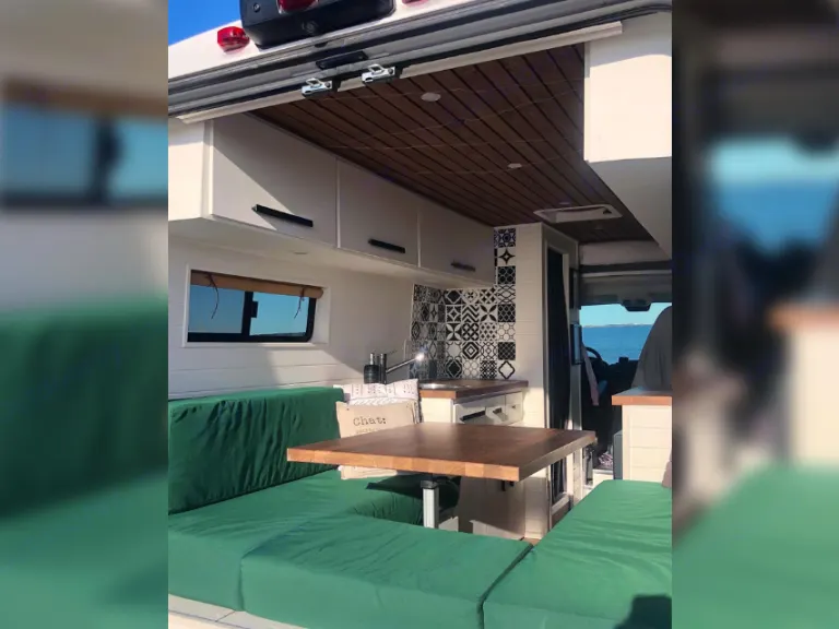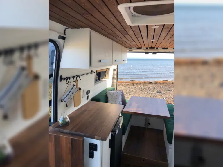 La section dinette est très polyvalente. La table amovible permet différentes configurations : que ce soit un coin repas confortable et spacieux, un coin lounge ou un lit double standard, tout se convertit facilement.Nous ne voulions pas faire de compromis sur le confort. Dans notre van, vous aurez accès à un matelas double standard de qualité (matelas mousse de 6 pouces).De plus, profitez du visionnement d’un bon film grâce au projecteur et au haut-parleur Bluetooth qui sont inclus lors de votre séjour!La cuisine est parfaite pour vous cuisiner de bons petits plats, comme à la maison : toute équipée avec plaque à induction, mini four, évier et frigo avec congélateur. L’espace comptoir est également spacieux.Énormément de rangements disponibles pour les vêtements et la nourriture.Douche intérieure avec eau chaude et bon débit.Toilette portative sans odeurs et facile d’entretien.Notes :