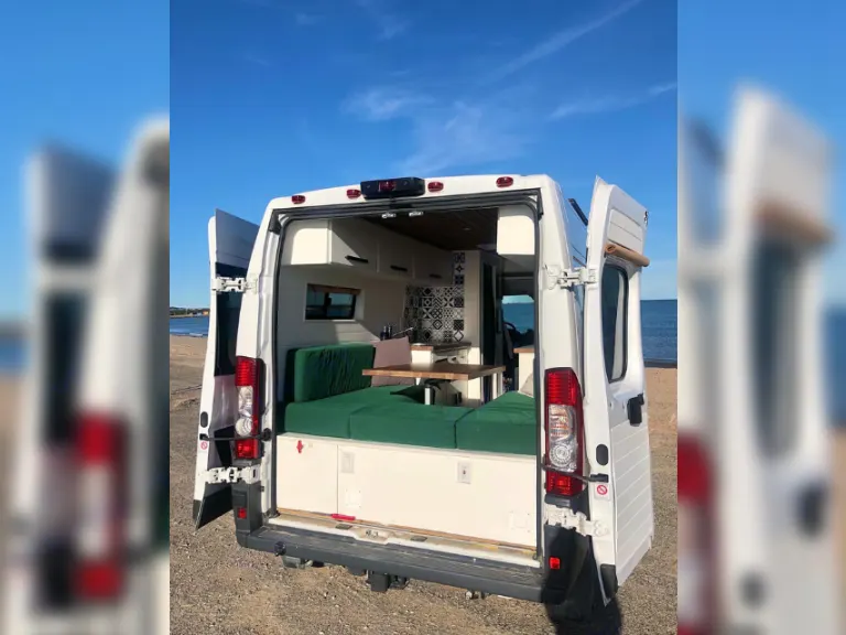 Van alimentée à 100% par les panneaux solaires (aucun propane)! Au besoin, possibilité de la brancher sur une source de courant externe ou de recharger les batteries en roulant.Réservoir d’eau propre (non potable), réservoir d’eau grise, chauffe-eau, toilette portative (Porta Potti).Aménagement de la van :
