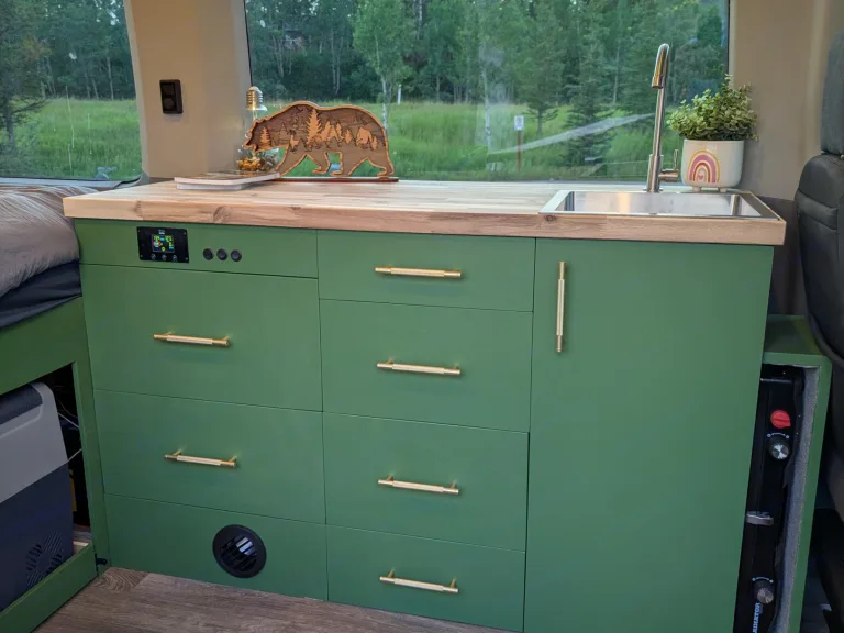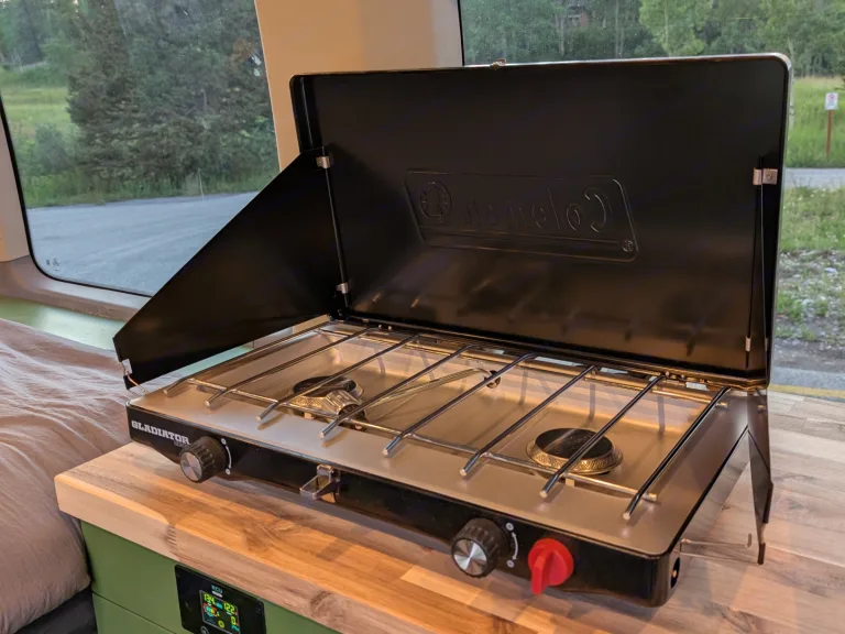 - Velit Gas Heater (Tied Into Van’s Gas Tank) – Stay warm without needing a campfire or a cuddle buddy.