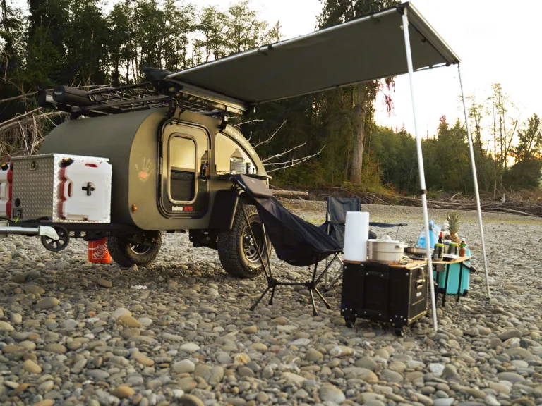 It can be towed with almost any 4 cyl vehicle.Plenty of room for two people and a medium sized pet.Marine battery with plenty of USBs and a 120v outlet, as well as shore power connection.Two CVT awnings, cargo rack, 4 gallon road shower, 2 fuel rotopax and 2 water rotopax.It has a built in safe to store firearms or personal belongings. The mattress folds up to secure cargo to the deck.Perfect for off grid camping trips or a normal tent spot.Burn ban? No problem! Take the iKamper Aioks Camp Kitchen with you! What's included-Max coupler fully articulating hitch or ball hitch for a 2 inch receiver-Leveling jacks-Overhead FanRecommendationsCamp ANYWHERE!