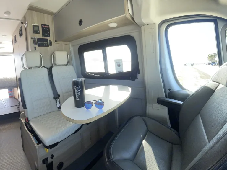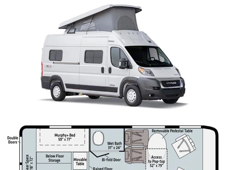 KEY FeaturesPop-Top – The fiberglass Pop-top sleeping area in both the 59P and 59PX floorplans is a standard feature. The Pop-Top sleeping area features the Froli sleep system and measures 52”x79” and can be accessed with the included space saving ladder. This sleep area comfortably sleeps up to (2) people. The sides and rear of the Pop-Top can be unzipped to let in the outdoors. Lighting and outlets can be found in the Pop-Top area. You may choose to delete the Pop-Top sleeping area entirely in either of these floorplans.Solar – Solar is a standard feature in the Solis to use for off-grid power. The Solis is equipped with a 220-watt Flexible Solar Panel fitted to the top of the pop-top or 170-watt solar panel with controller when there is no pop-top.Enjoy the Ride – The Solis provides a quiet rattle-free ride. The blackout zippered window coverings provide privacy and block out the light while also adding an extra layer of thermal and sound insulation.Dinette Seating – The dinette seating features automotive-grade seating with (2) 3-point seatbelts to allow you to bring family or friends along for the adventure. The cab seats can be swiveled to join the dinette area.Queen Sized Murphy+ Bed – The Murphy+ Bed found in the Solis measures 59”x77” when lowered. It can be easily stored when not in use and replaced with an integrated movable table that is a comfortable workspace with amazing views. The 59P floorplan is available with the option to change out the Murphy+ Bed with a sofa/bed measuring 59”x71”.4 Season –The premium ceiling-to-floor Insulation in the Solis keeps weather at bay and the sounds of the road out of your Solis. The automotive-grade foam insulation found in the roof and sidewalls of the Solis provide improved thermal control and sound reduction while traveling. This premium insulation in the Solis coupled with the Truma Combi Eco Heating System and waterlines that are located inside the coach extend your camping season keeping your waterlines warm in cold temperatures. The Truma Combi Eco heating system is a furnace and water heater in one. In the summer, you can run it as just a water heater with the continuous on-demand water system. In cooler climates you can run both the furnace and the water heater. The Truma Combi heater is ultra-quiet, economical to run, and will keep your Solis comfortable during cooler temperatures.Rear Annex – The Rear Annex extends your living space in the Solis. You can also use this area to hang gear or use it as an exterior shower. The prop rod, magnets, and curtain are included and store conveniently inside your Solis.Ducted Shower Heat – The ducted heat in the 31”x24” Wet Bath of the Solis keeps the shower area warm. It also helps speed up the drying of any gear that you may have hanging in this area.The Winnebago Solis is a fuel-efficient Class B gas motorhome designed for adventure on any budget. The all-weather camper van makes you feel right at home no matter where you decide to set up camp! Adapt to any adventure when you own a Winnebago Solis Class B gas motorhome!