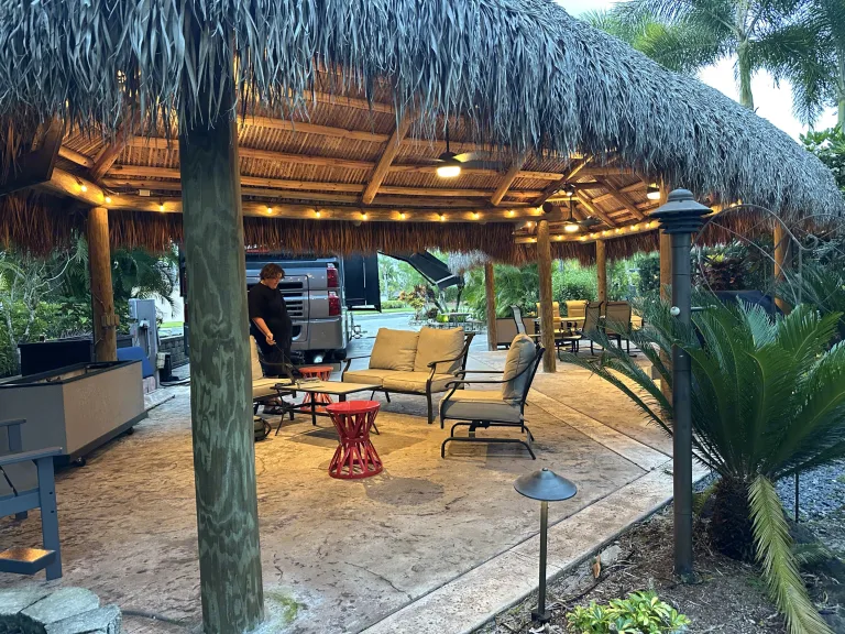 Entertainment Package: Multiple flat-screen TVs, premium sound system, DVD/Bluetooth, and an exterior entertainment center.