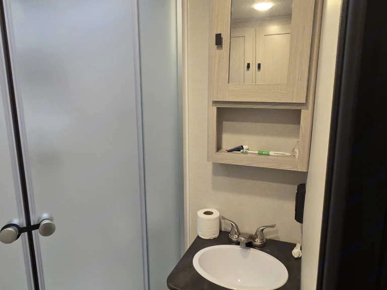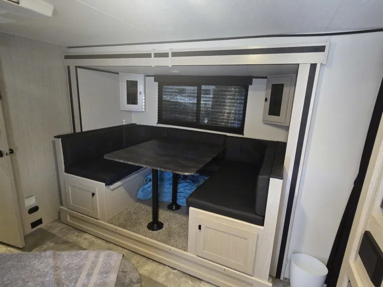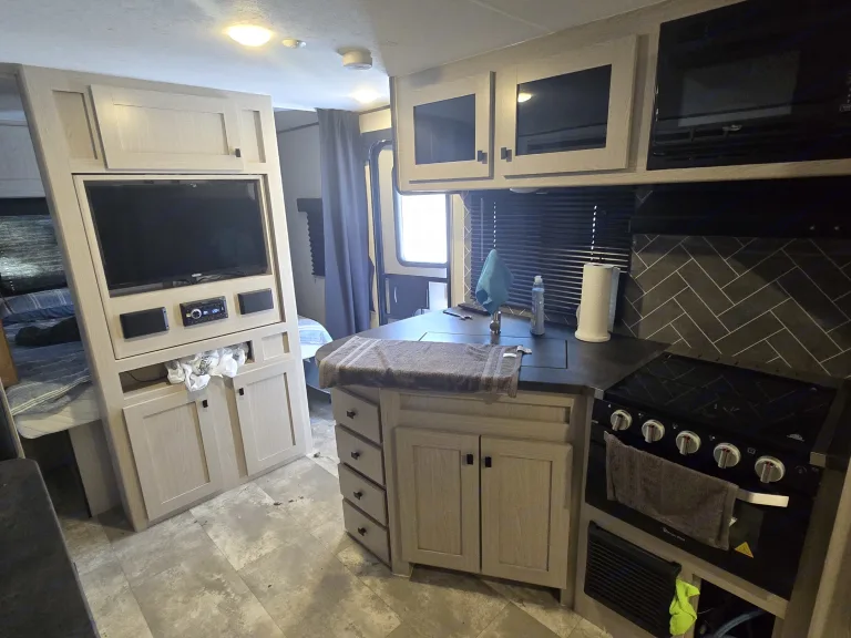 - Flexible living area: convertible dinette provides extra sleeping space for kids or guests — sleeps 4 people.- Kitchen: full galley with 3-burner stove, oven and microwave, refrigerator, generous counter space, deep sink, and plenty of cabinets stocked with dishes, utensils, cookware, and basic cooking staples (salt/pepper, oil).