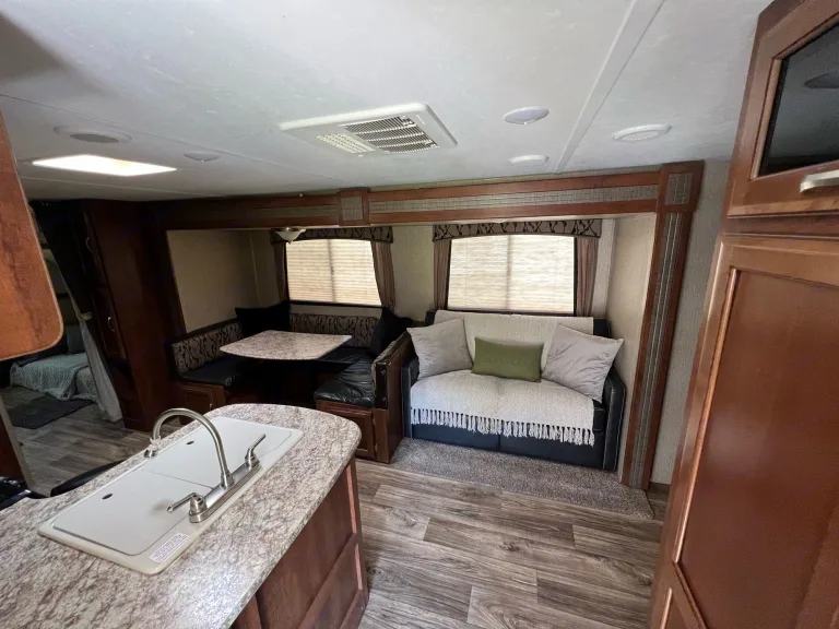 Super Light, luxury double bathroom bunkhouse travel trailer, big enough for the whole family with 2 bunks, 2 sleeper sofas, a dinette that makes into a bed and a queen bed in the master bedroom! A Slide in the Kitchen/Living area opens things up for plenty of family room and the slide in the bunkhouse gives the bunkhouse plenty of space too. This is a two bathroom rig. The half bathroom is located by the dining area and next to the bunk room and has an exterior entrance door also that makes it convenient for everyone inside and out, while the full bathroom with shower is just down the hall from the living area and adjacent to the master bedroom. The outside kitchen has a small electric refrigerator, a double burner top, and a wash basin to expands your cooking space & enjoyment along with a 20' awning under which to relax and enjoy your time in the great outdoors.... Both the inside refrigerator and hot water heater run off either gas or electric at a flip of the switch. This travel trailer comes fully stocked with linens, dishes, utensils, cookware, toaster, and coffee pot (k-cup and standard grounds capable) and outdoor folding chairs. Optional paid add-ons: dual-fuel (gas & propane) generator ($30day), fishing kayaks, canoes, 12 person/2 room tent.
