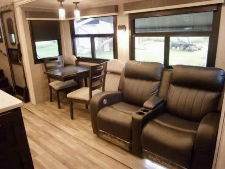 • Dual leather power recliners with heat, massage, LED lighting and upholders.