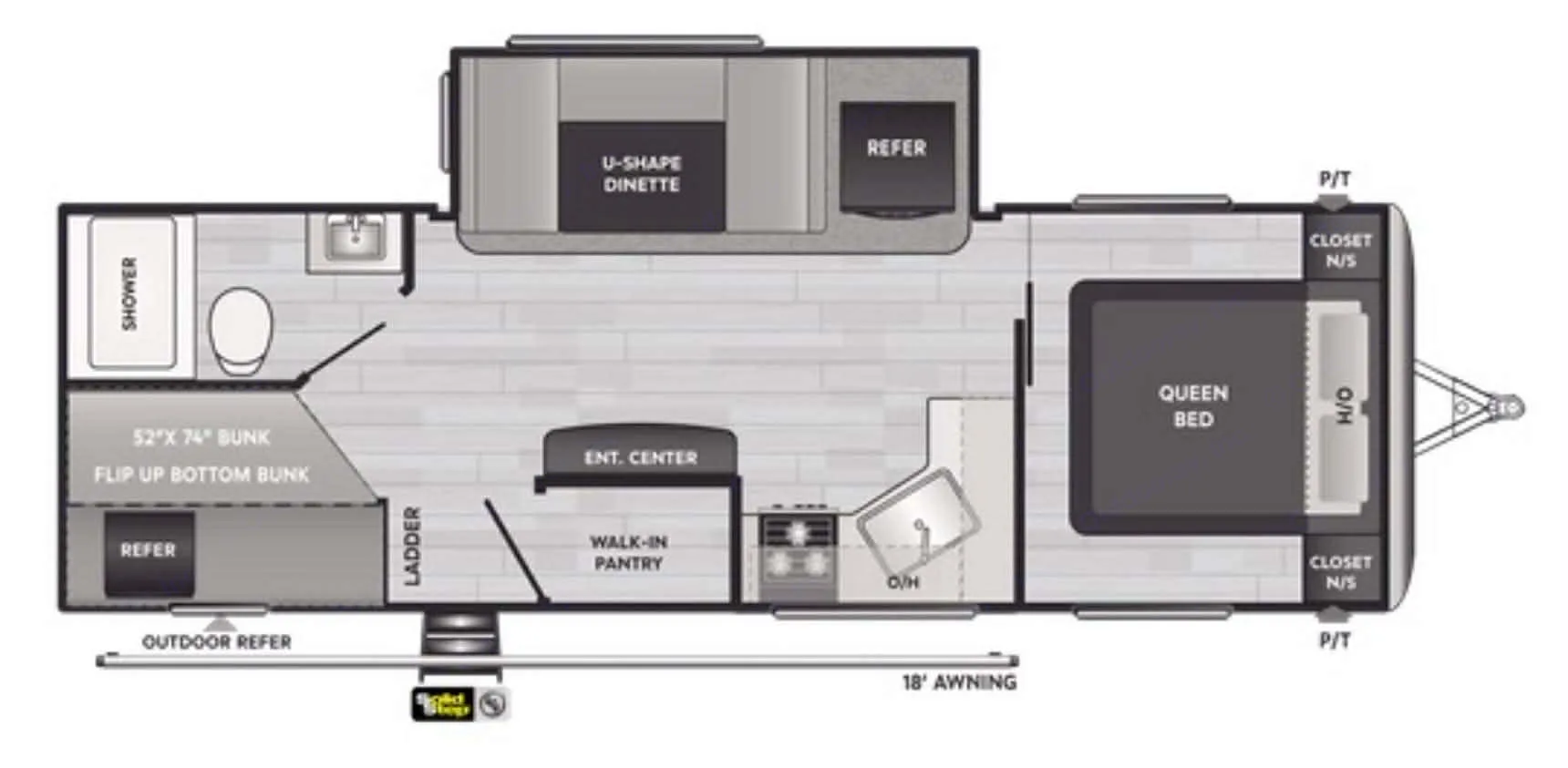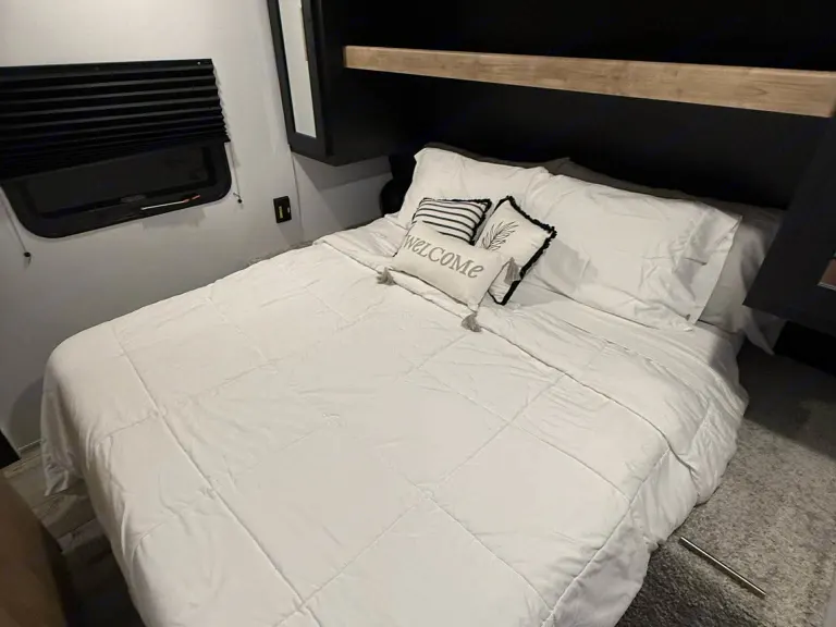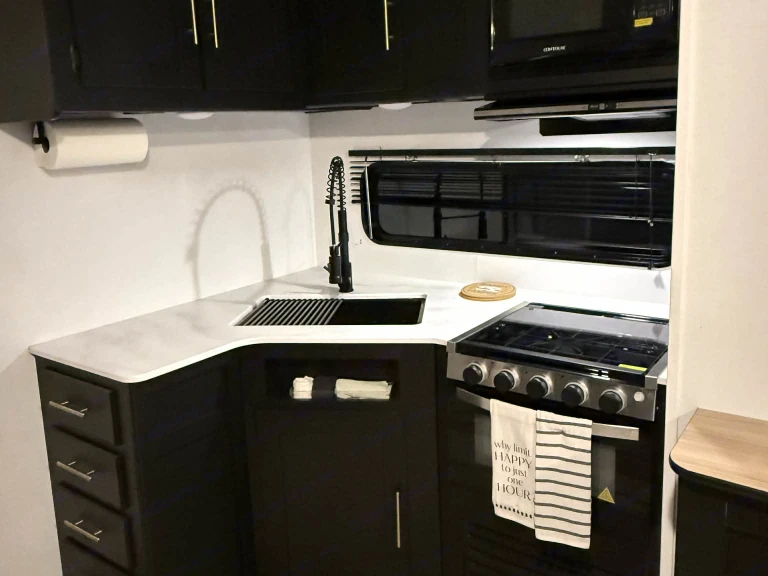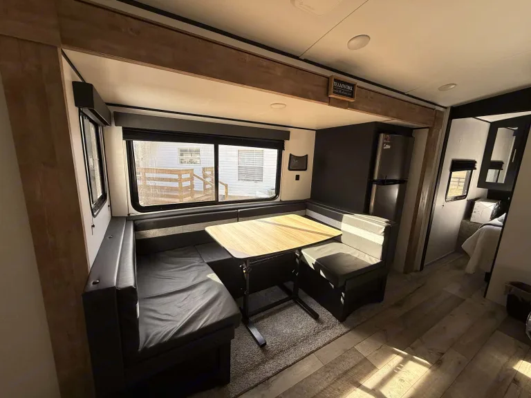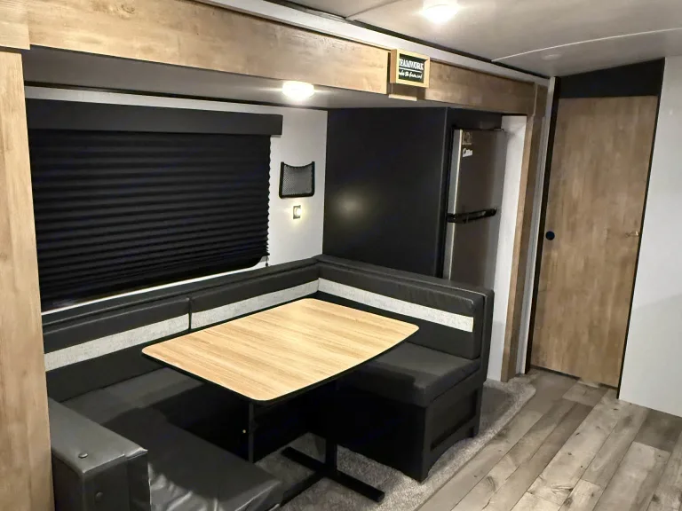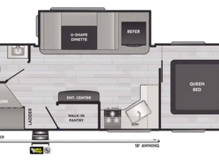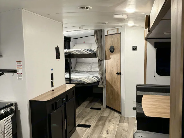 With a queen size master bed, two bunks and a large dinette that makes into a bed, this sweet little RV gives you plenty of room for your sleeping arrangements and the large slide makes the living area spacious and comfortable..