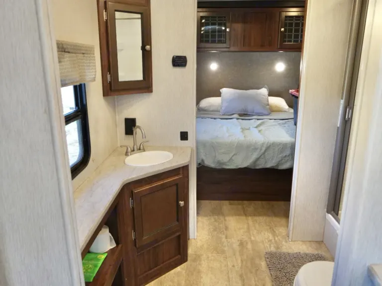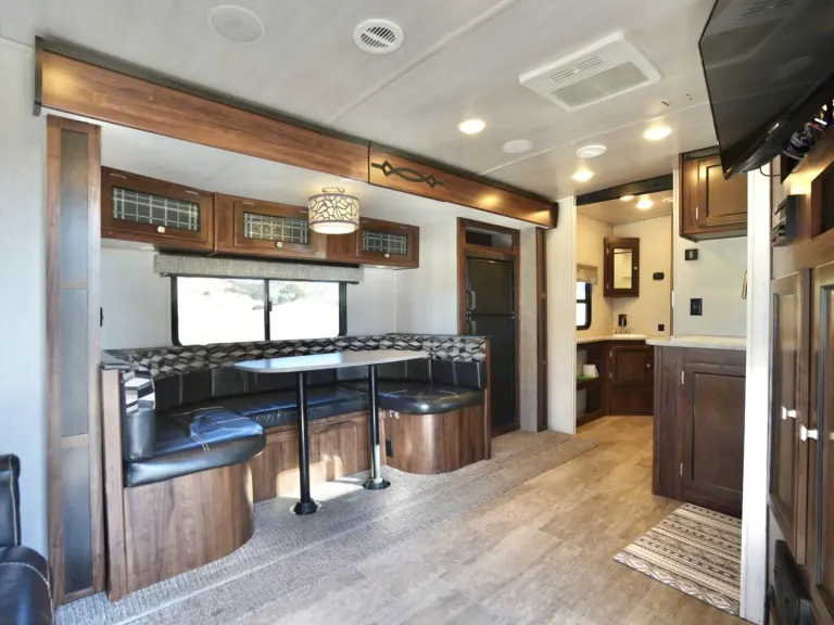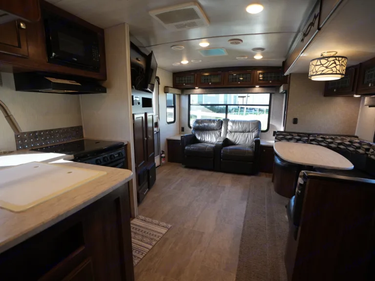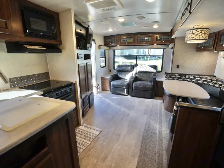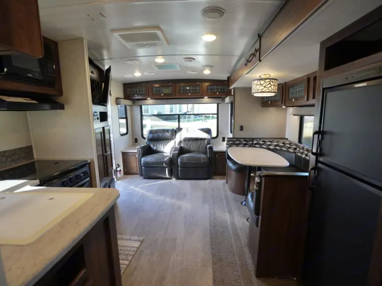 The trailer sleeps 2 adults in the queen bed and 1-2 people in the twin-XL dinette conversion. We have a nice foam mattress on the queen bed as well as a foam topper on the Twin-XL bed, so they are both very cozy! There are also two reclining arm chairs that are extremely comfortable! We love the large window out the back, providing plentiful natural lighting throughout.
