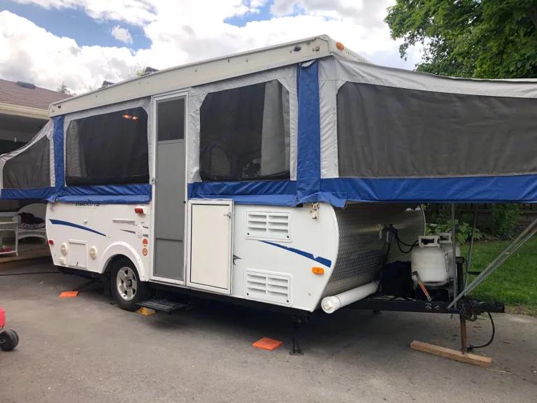 Fresh and bright renovated tent trailer that extends to 26 feet with a dinette slide out.Bright summer sunshine flows beautifully through the mesh siding, blackout curtains are hung if you would like an afternoon nap or chance to sleep in.Foods stay cold without a cooler of drippy ice when you use it the fridge. Wash up dishes inside after meals in the bug free camper with a double bowl sink. Zip up the mesh and turn on the heater for a cozy camp experience. Queen beds at either end of the trailer, foldout couch and convertible dinette to sleeping area means plenty of space for people to sleep.I offer full service delivery of the trailer which includes set-up, pulling out beds, standing up sides, turning on fridge to cool, connecting water, and electric if your site has the hookups, prepping the propane lines and stove for use. When you are finished I will return to your site, turn off and disconnecting all propane, electric and water connections, lower and packing tent trailer to take it away. All you do is drive up to your site and move in.Repair Note: