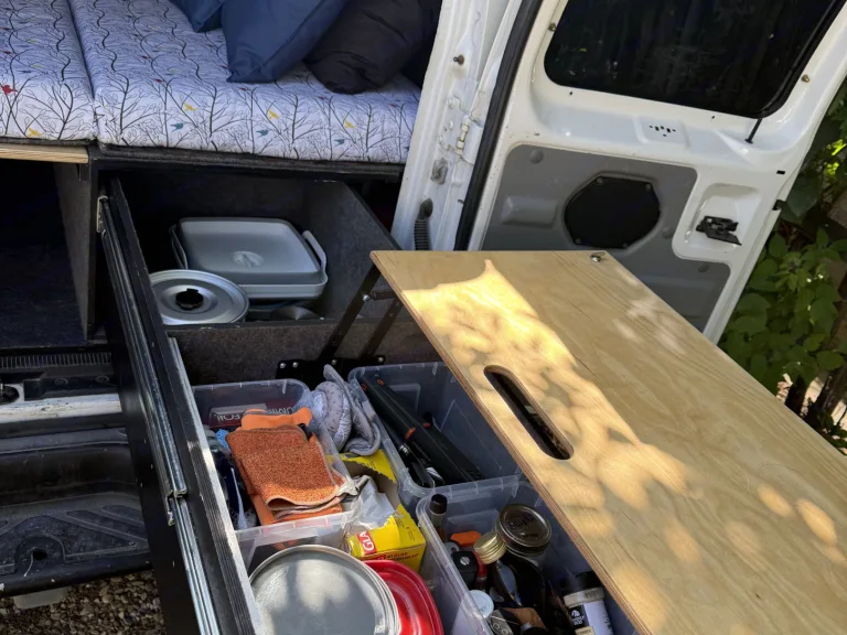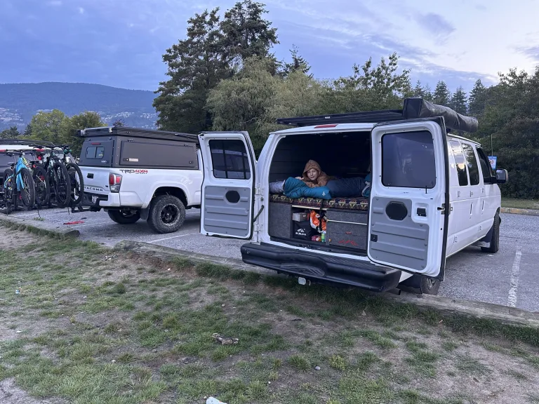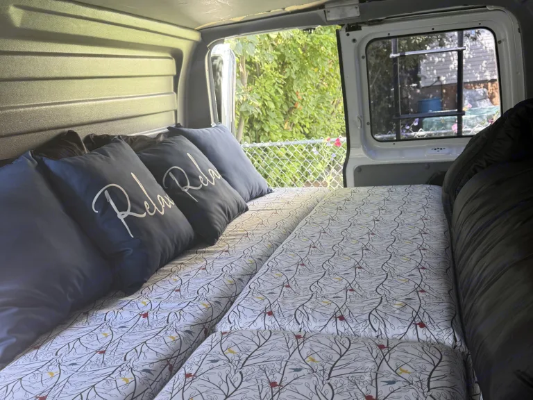 Jann is the perfect van for your next trip. Don’t worry about having camping supplies; she has everything included in your rental including sleeping bags and pillows. All you need to bring is food! She has a comfortable memory foam sleeping area that converts to an indoor dinette, complete with lots of storage, and a 270 degree awning. No set up required when all you have to do is pull out the awning and open the doors to the great outdoors. All the supplies inside are high quality and even includes the use of a 45L Yeti Tundra cooler. In the back there is a pull out kitchen with a GSI camping stove. Some of the amenities included are 2x10# propane tanks, a gas firebowl, folding high-back chairs, small power source to charge phones and electronics, a water jug, all kitchen supplies, and even the smallest of conveniences like headlamps and board games.