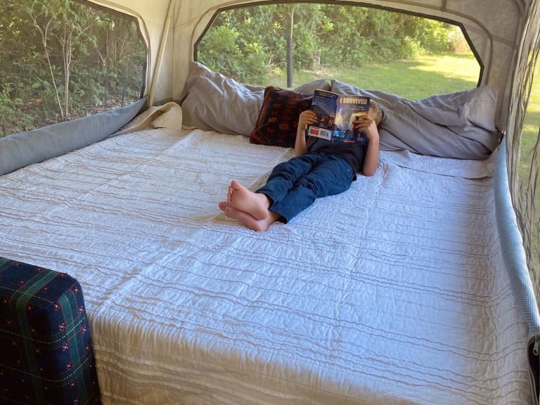 We limit the radius for campers to only 75 miles away from the pickup location. What's includedFridge. Cooking stove indoor/outdoor. Twinkle lights. A/C. Bedding. Basic cooking necessities. Coffee pot.RecommendationsWe love Little Grassy Campground and Crab Orchard Lake Campground!Other things to noteYou will need to bring camp chairs.