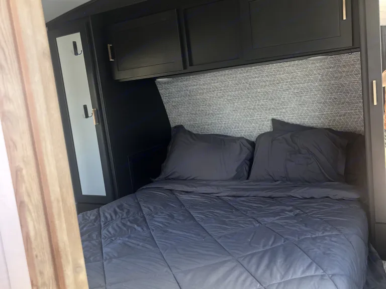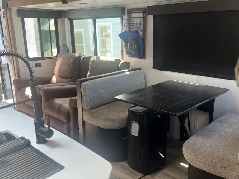 Clean, modern RV ready for holiday guests, short-term housing, or a cozy winter escape. Heated, insulated, and comfortable all season.• Sleeps 4 (queen master, two bunks, dinette conversion)