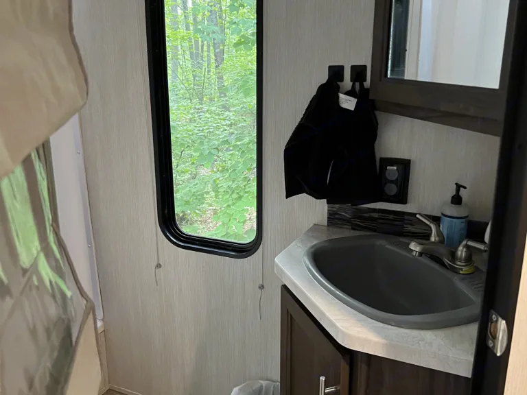 I'd advise you not take a shower in the bathroom, its small. Most campgrounds have showers these days.