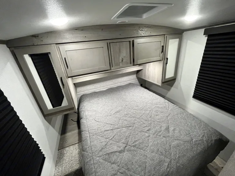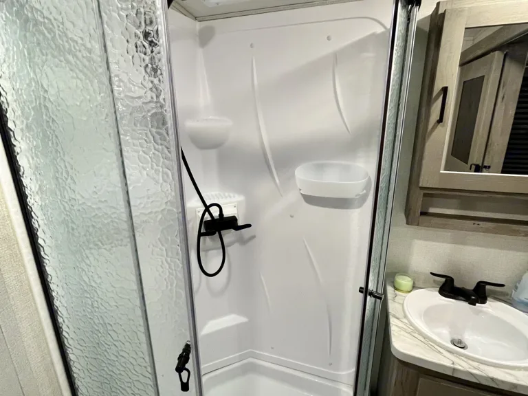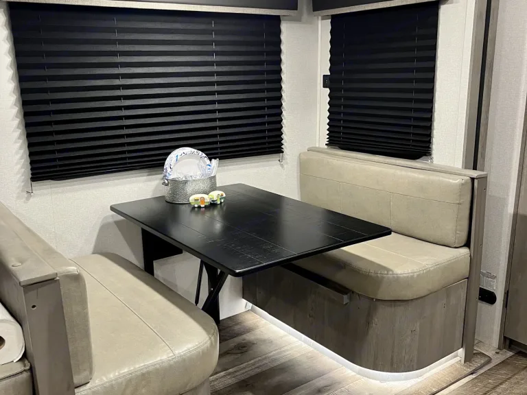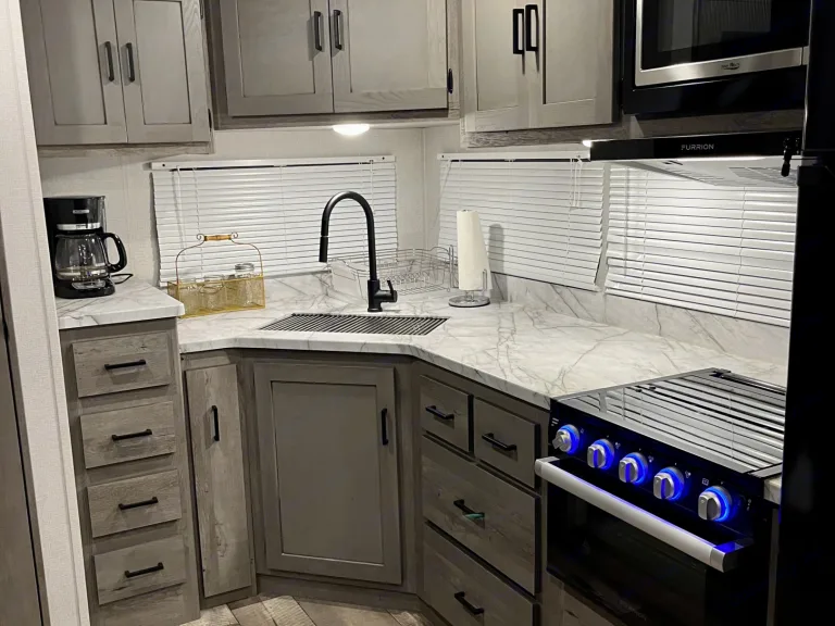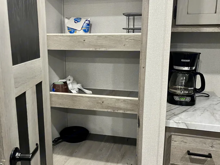 Residential queen size pillow top mattress, walk in shower, leather theater recliner seats, 55’ screen tv with cable hook up or bring in your own roku or fire stick to connect to your favorite tv shows and movies – if wi-fi is available at the campground-, great sound system with Bluetooth for inside and outside speakers, oversized refrigerator and freezer, oven, stove, microwave, coffee maker, dinette seating that converts to a second bed, oversized pantry. The camper also has black out shades and plenty of storage.