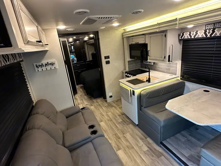 Our pet friendly RV is very clean and user friendly. Features automatic leveling, push button awning, 2 slide out, exterior speakers, and enough room to comfortably sleep 6. Comfortable RV King bed in the master bedroom, over cab bed and dinette that can also be converted to sleeping areas. RV features 3 TV’s in the common area, master bedroom and outside. The RV is easy to drive and features the Ford Godzilla V-8 motor which does not sacrifice power but makes it better on fuel than other RV's of similar size. RV is equipped with a generator and two air conditioners for those hot summer days!