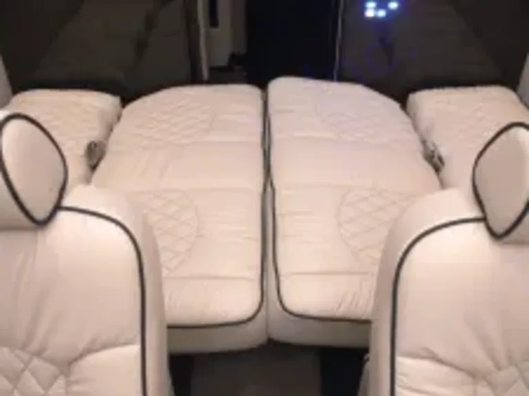 Designed more for family use, there are six beautifully plush captain’s chairs and two bench seats. All passengers travel in comfort and style whether it’s a weekend excursion with family, a week-long vacation with grandparents and kids, or golfing with friends.The spacious interior is truly amazing. The classy Maybach ceiling allows plenty of headroom for passengers to freely stand up and walk around. Middle captain’s chairs swivel so guests can either face forward or turn around and have a conversation with passengers in the back. It’s perfect for all occasions–both in a family configuration or a night on the town. The third row of captain’s chairs has power footrests and fold-away solid wood lap tables–great for relaxing, reading, working on a laptop, playing games, or watching TV on one of the flat screens. And, let’s not forget the two comfortable couches in the back that make a bed for a quick nap or an overnight excursion. There’s even a large dorm-size refrigerator and microwave conveniently tucked away but within reach for drinks and snacks while on the road. There is a private bathroom for use on longer extrusions as well.