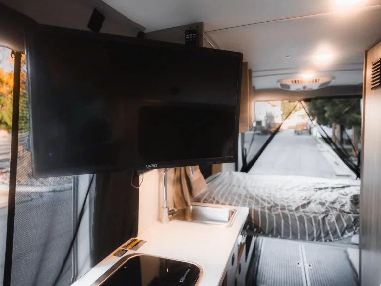 You also get a 2-burner Gas cook-top, 12v fridge with freezer, kitchen sink, cabinet spaces, enclosed bathroom with toilet, hot shower, AC, Heating, Screened Windows with blackout covers,