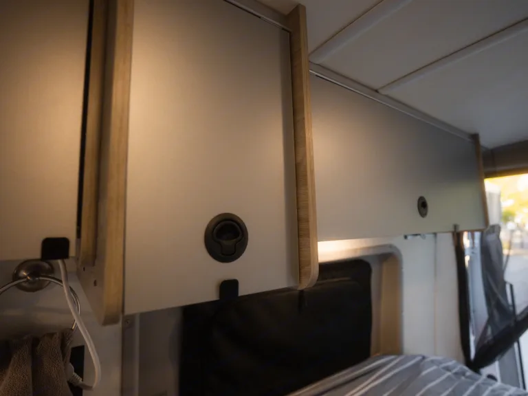 Gear Garage, L-track Anchors to secure gear, Murphy bed, Pop-top roof tent bed with zipper screened windows + 12v and USB ports.