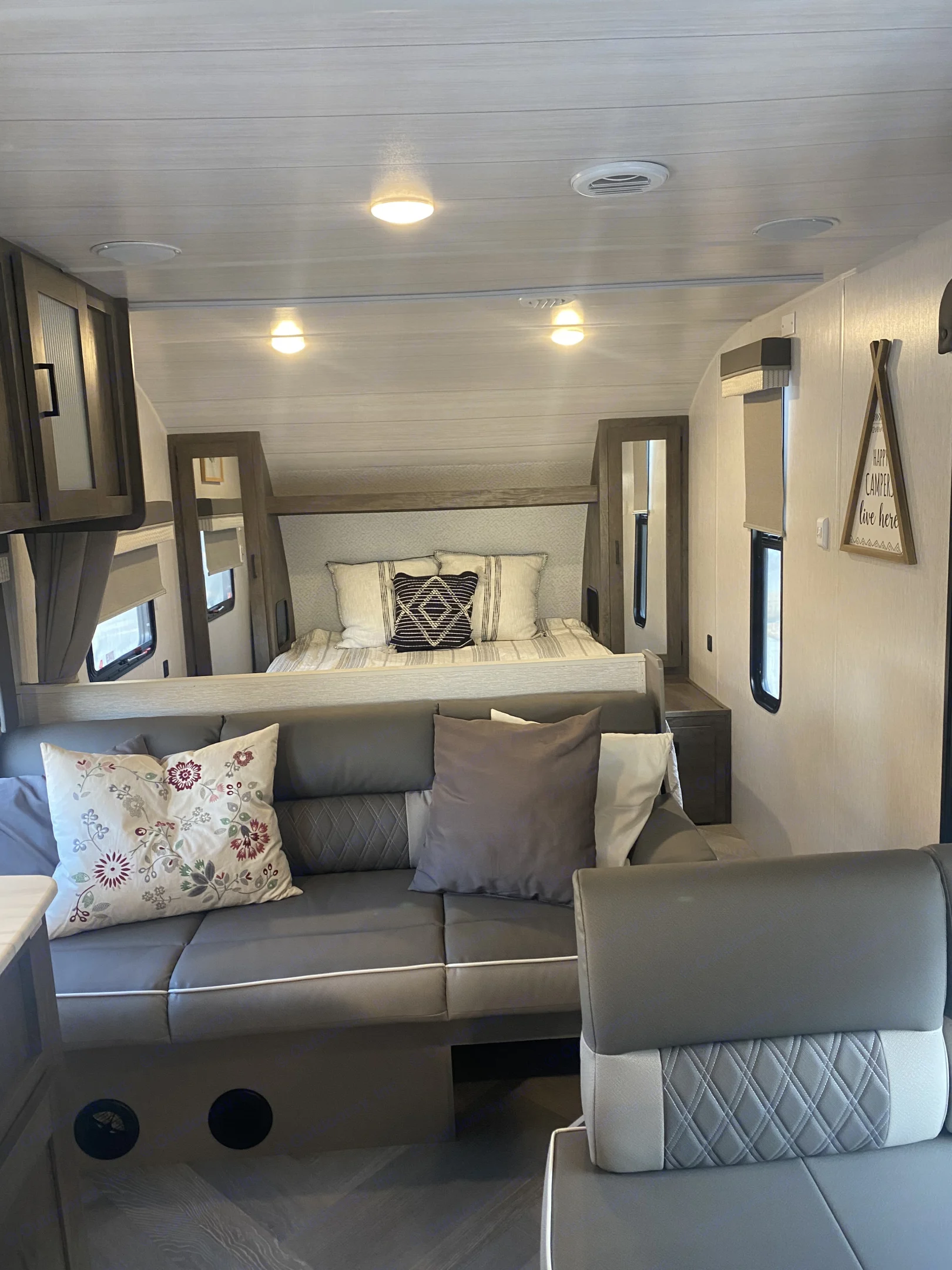 This brand-new Forest River travel trailer is a lightweight bunkhouse that is packed with features, from the front queen bed to the back double bunks. You also get huge campsite windows, a bench dinette, a sofa, and a fully appointed kitchen with 11 CU. FT. refrigerator.