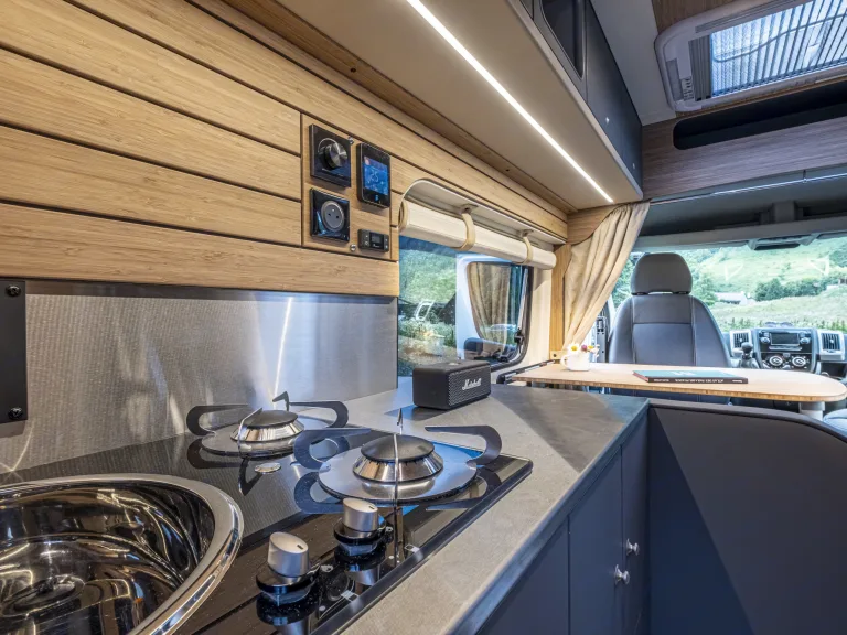 Cuisine : le van ØBerwild met à disposition sa cuisine tout équipée intégrant évier, table de cuisson à gaz, machine à café, bouilloire, frigidaire et vaisselle