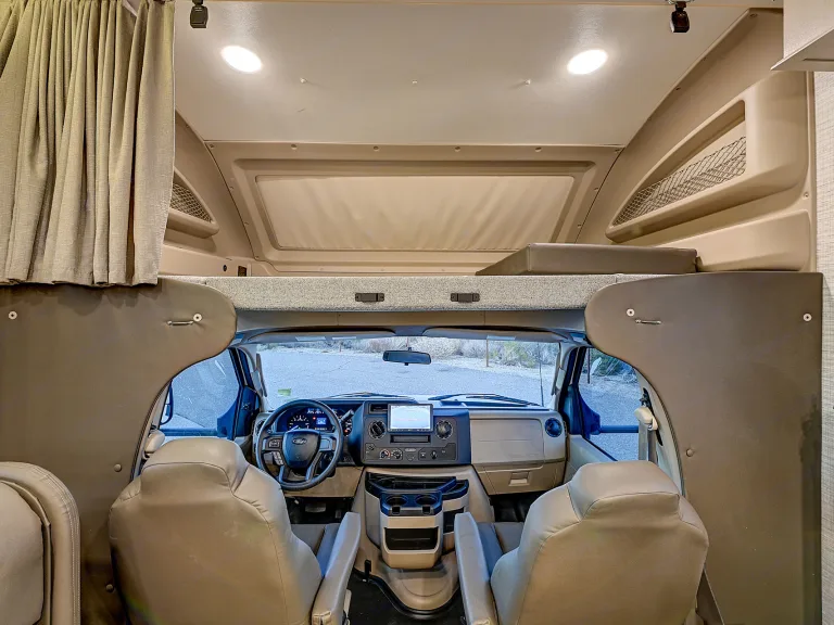 Massive panoramic window over front cab for improved interior lighting and scenic viewing