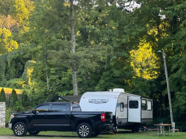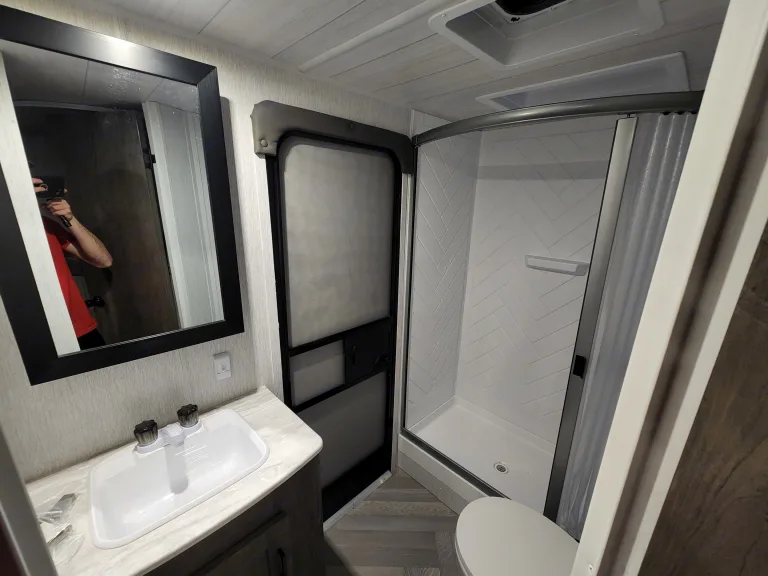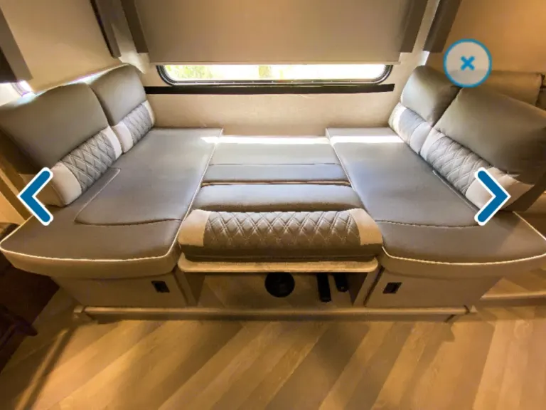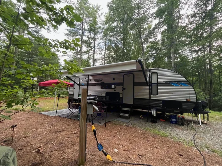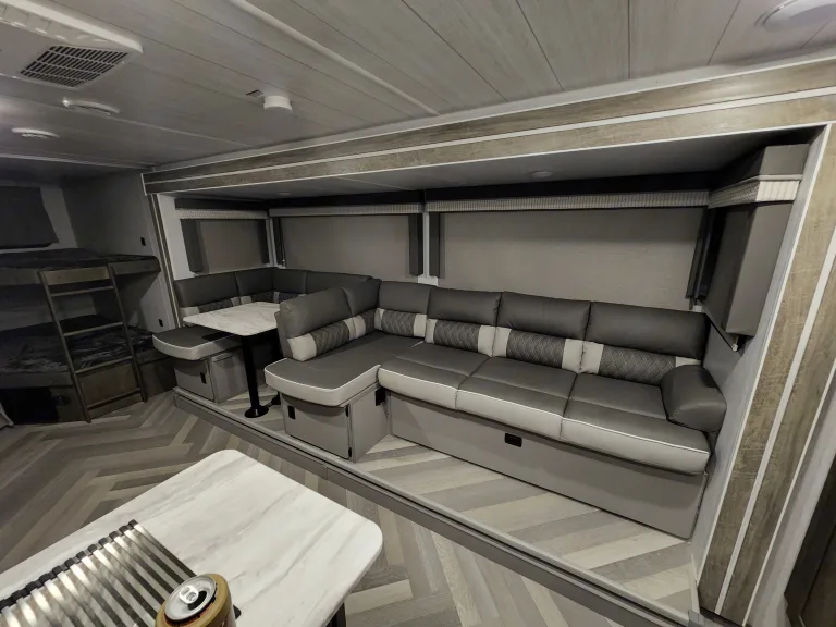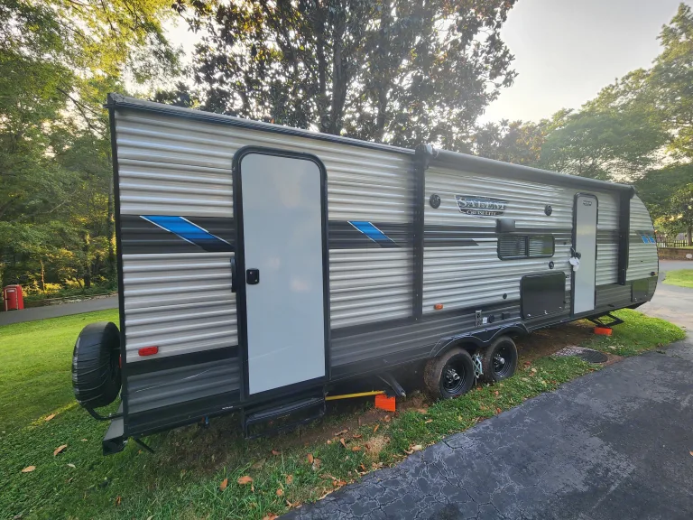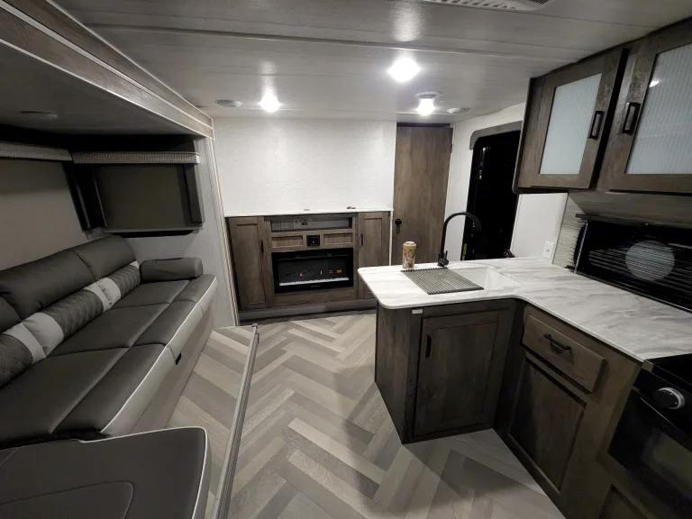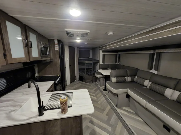 All connect to a 5" monitor and can double as security cameras when not driving.The master bedroom has a solid door for privacy, a memory foam mattress, wall mounted smart TV, storage for clothes & shoes and usb ports on both sides of the bed.The main living area has a jack knife sofa that is really comfortable. The full U shaped dinette gives you space for everyone to eat together. The dinette also converts into a full size bed. A 42" smart TV above the electric fireplace, functions as a heater and lighting. Two ceiling mounted speakers that can be connected to your phone via Bluetooth. Giant windows to let in natural lighting. Tons of storage with included totes under the table and sofa.The kitchen has everything you could possibly need: microwave, 3 burner gas range, gas oven, 11 qu/ft refrigerator & freezer, double sink and a large pantry for groceries. You can easily store enough food to feed a family of four for a week in this thing.The bunk beds are 3/4 width of a full size bed so even an adult has room to sleep.The bathroom has a solid door for privacy as well as a exit door, which is very convenient for not tracking dirt or sand everywhere when you come back in from a day outside. The shower is spacious and the combo gas/electric water heater allows everyone to take warm showers.On the outside there is a hose connection with included hose, outdoor kitchen that has a gas griddle and mini fridge. A 14' awning keeps everyone covered from the elements.All electric, septic & water hookups are in the camper.I have tons of extra accessories and convenience items that I don't have room to list but can tell about when booking the camper.What's includedWater hookup with water filtration system, septic hookup, 30amp electric cables, towel drying rack, spare tire, 3 wired in cameras, digital keypad entry lock with fob, outdoor food prep table, electric torque wrench for leveling jacks, 2 outdoor chairs, outdoor carpets, kitchen utensils, silverware, plates, cups, bowls, pots & pans, broom & dustpan, vacuum, storage totes.Pretty much everything you need is included. Just pack your clothes and personal belongings and you'll be set.